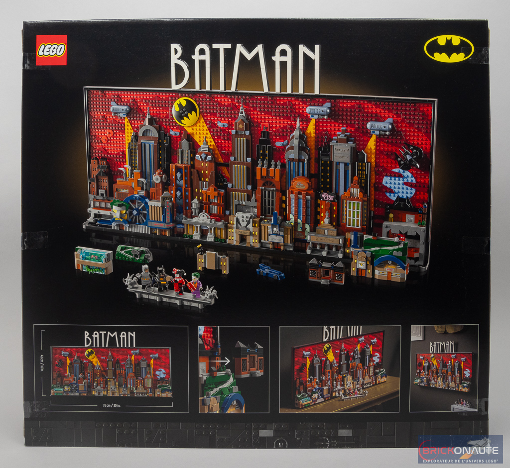 La boîte est plutôt imposante (logique pour un set de 4210 pièces) mais finalement pas si épaisse que cela, l’inventaire étant constitué de nombreuses petites pièces. Elle nous présente sur sa face avant le tableau vu de face, avec un petit logo Batman: The Animated Series dans le coin supérieur droit. Pour le coup, le fond noir et la bande gris foncé reprenant les principales caractéristiques du set sont plutôt adaptées pour le Chevalier Noir.