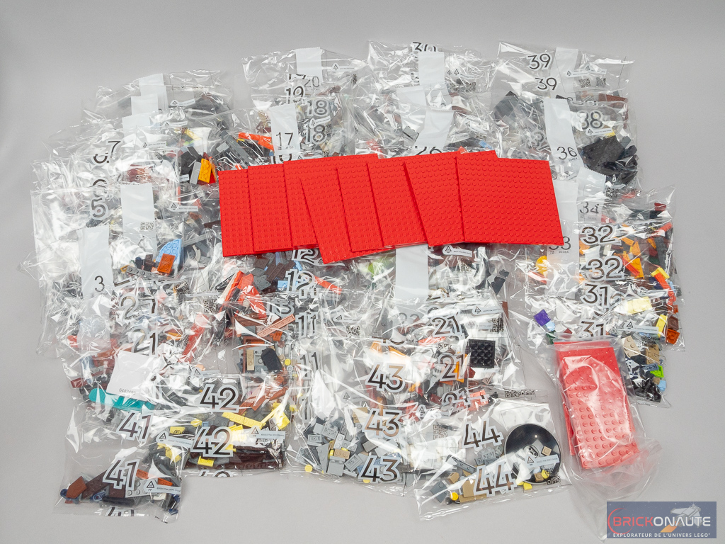 À l’intérieur de la boîte, on trouve 44 sachets de pièces numérotés de 1 à 44 (pas de « double »), un sachet sans numéro avec quelques plates rouges, et 8 autres plates rouges de 16×16 tenons en vrac. Une pochette en carton contient les deux notices d’instructions (288 et 336 pages) et deux grandes planches d’autocollants pour un total de 66 stickers. L’inventaire est plutôt généreux avec 4210 pièces pour 299,99 €, on y trouve quelques éléments intéressants dont une soixantaine de plates dans la nouvelle couleur reddish orange, des demi-cylindres sand blue pour les zeppelins de la police, et un grand dish tampographié pour le Batsignal.
