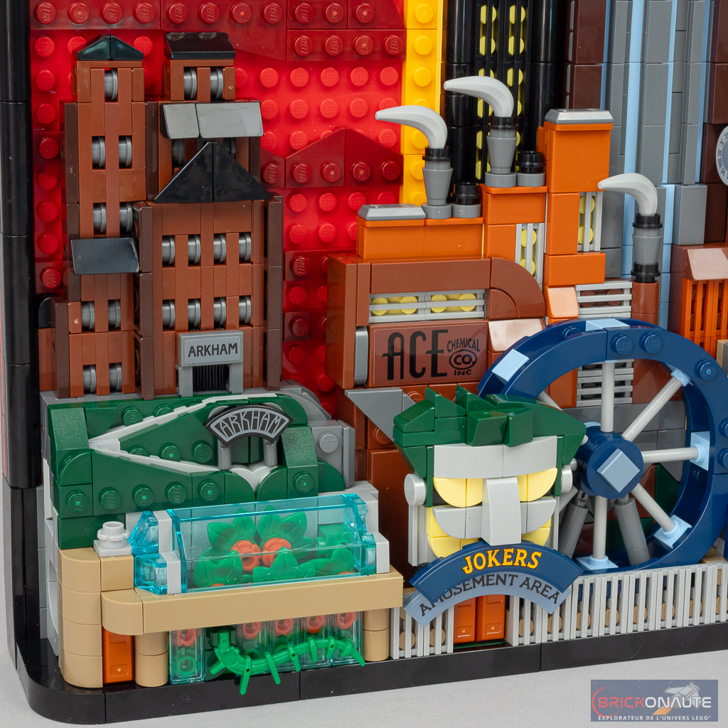 J’aime beaucoup cette série Batman, tout comme l’ambiance « Dark Déco » qui s’en dégage. Cette grande fresque est réussie, avec ces effets en relief et les scènes cachées. C’est toujours navrant qu’un produit destiné à l’expo et à ce prix ait toujours des autocollants, du moins ceux qui restent visibles… Que quatre minifigs, mais c’est le meilleur choix de personnages.
