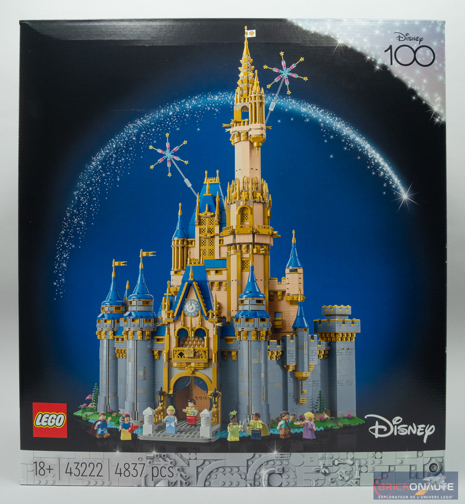 La boîte est plutôt imposante et lourde – logique pour un set de 4837 pièces. Elle reprend les codes habituels des sets dédiés aux adultes, avec un set présenté sur un fond noir et un liseré blanc avec la mention « 18+ », le numéro du set et son nombre de pièces. Seule « fantaisie », on retrouve le logo « Disney 100 » dans le coin supérieur droit.