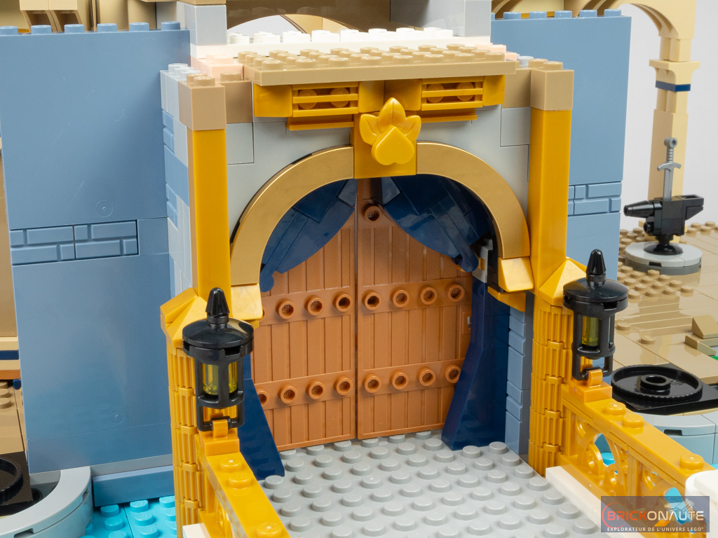Nous passons ensuite à l’entrée du château, avec de chaque côté des deux portes (fixées sur des clips) des grands murs sand blue. Autour de la porte, un joli travail est fait sur les rideaux – la partie supérieure est clipsée pour obtenir l’angle désiré. On ajoute deux belles lanternes construites « à l’envers », et une collection de pièces dorées tout autour. Juste un petit regret au sujet de ces éléments dorés : les pièces teintées dans la masse sont moins brillantes que celles qui sont laquées – mais ces dernières sont plus sujettes aux rayures. Il en résulte une différence de rendu.