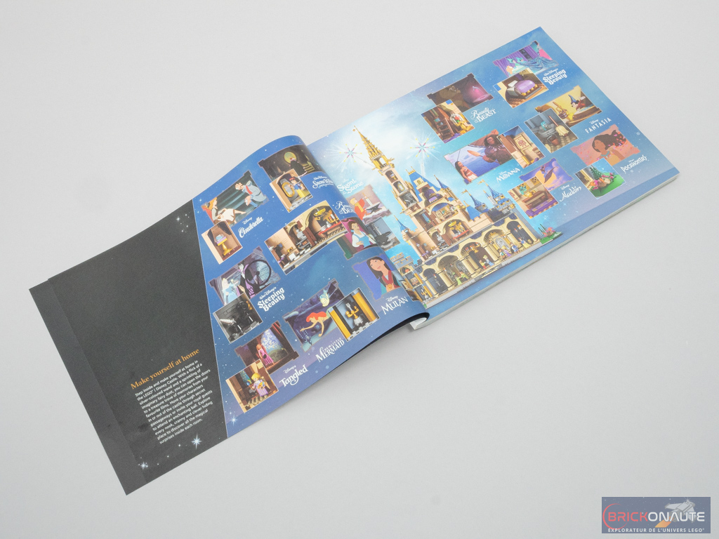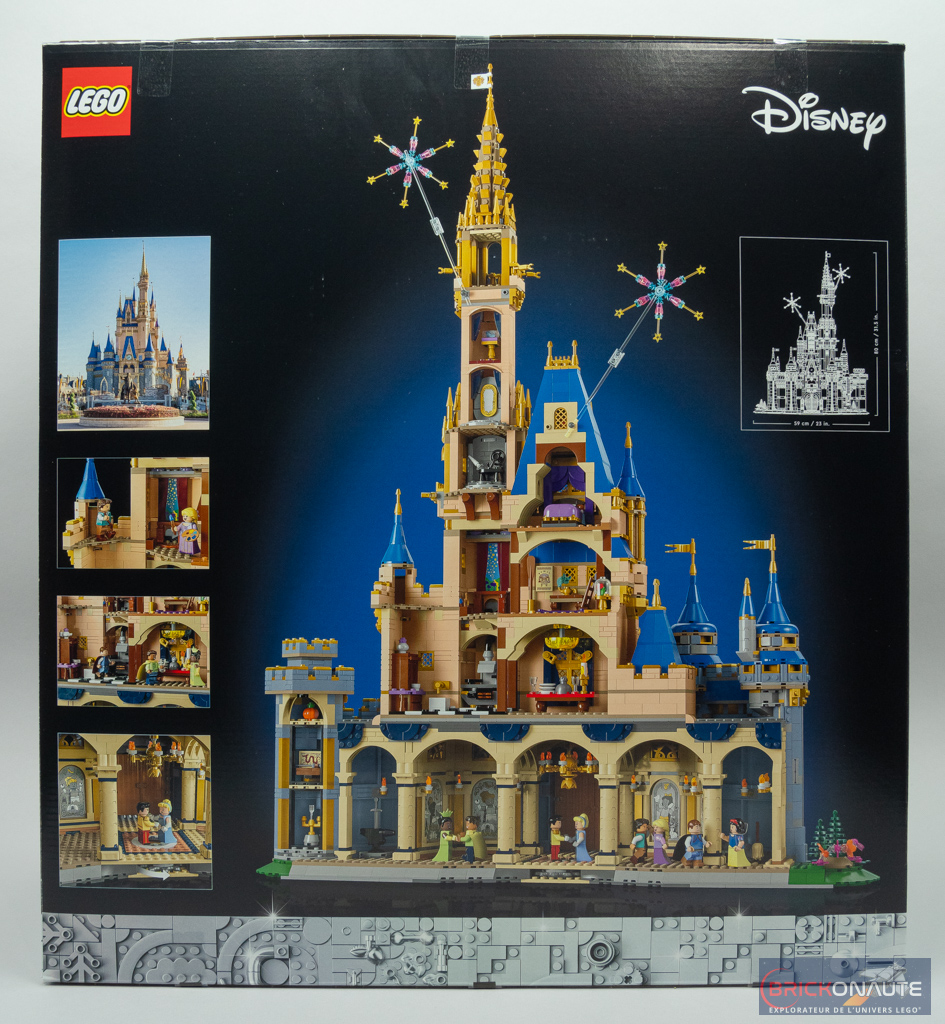 Au dos de la boîte, le château nous est présenté de dos – l’occasion de découvrir son aménagement intérieur. Un petit schéma nous précise les dimensions de l’ensemble, et il faudra prévoir un peu de place : il est légèrement plus grand que son prédécesseur avec 80cm sur la toise. Une photo nous montre le château du parc Walt Disney World d’Orlando, et 3 vignettes proposent quelques vues de détail.