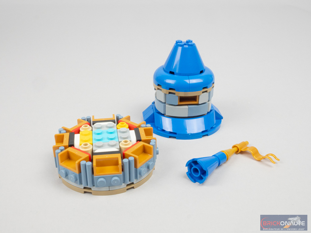 On attaque alors le dernier sachet de pièces, avec lequel on va construire la flèche. La technique de construction pourra faire penser à celle utilisée pour les sapins de Noël dans les sets hivernaux : une structure SNOT, et des assemblages de wedges qui se superposent. La partie basse, de forme octogonale, est obtenue en insérant un sous-assemblage complémentaire – je n’en ai pas pris de photo mais c’est très bien pensé. On assemble les différents morceaux du château, puis on construit deux feux d’artifice qui viennent se fixer sur des tiges transparentes – c’est mieux que les stud-shooters de la version de 2016 !