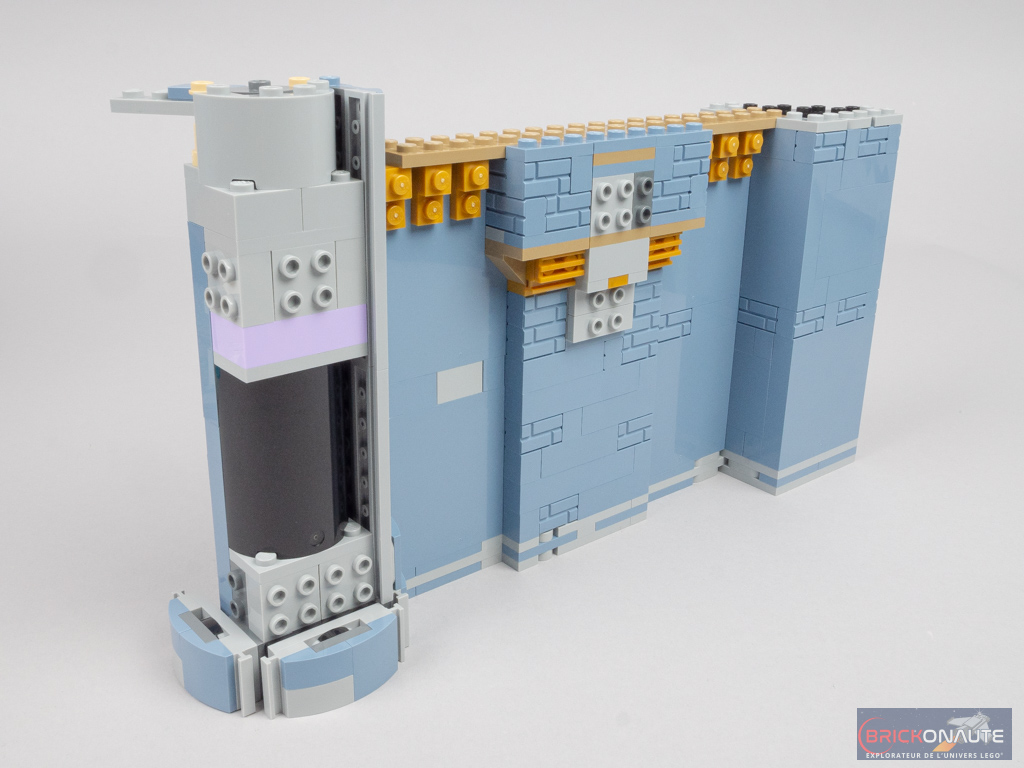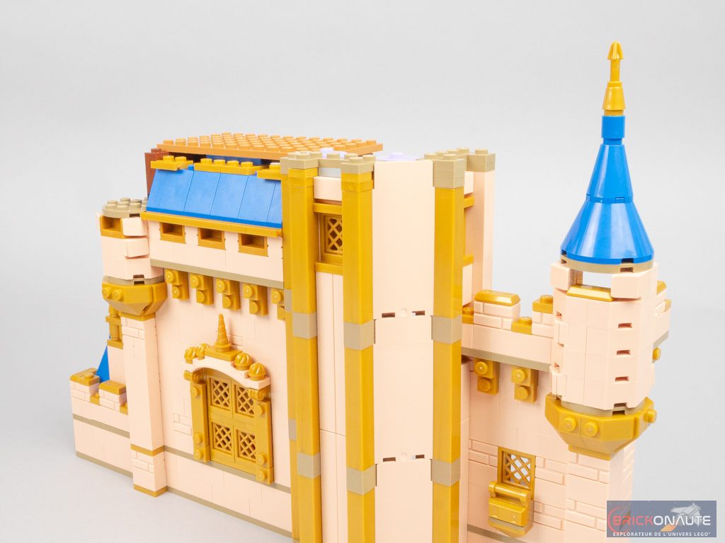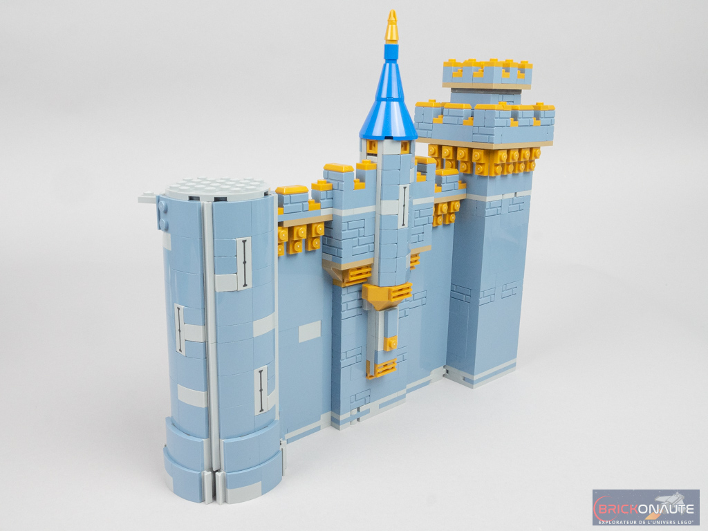 On s’attaque ensuite au sous-assemblage qui formera les deux tours situées à gauche. La portion de mur est constituée de grands panels sand blue avec quelques éléments intercalés entre deux rangées. Pour les tours, on assemble une structure à base de briques SNOT, qu’on vient ensuite couvrir de sous-ensembles aux formes arrondies – une technique classique chez LEGO pour reproduire les objets cylindriques comme les tours ou les fusées. Au-dessus des panels, on installe quelques créneaux dorés. Une petite turntable située en haut de la tour droite permettra de raccorder l’ensemble au château. Côté intérieur, une petite fontaine complète la référence à Fantasia.