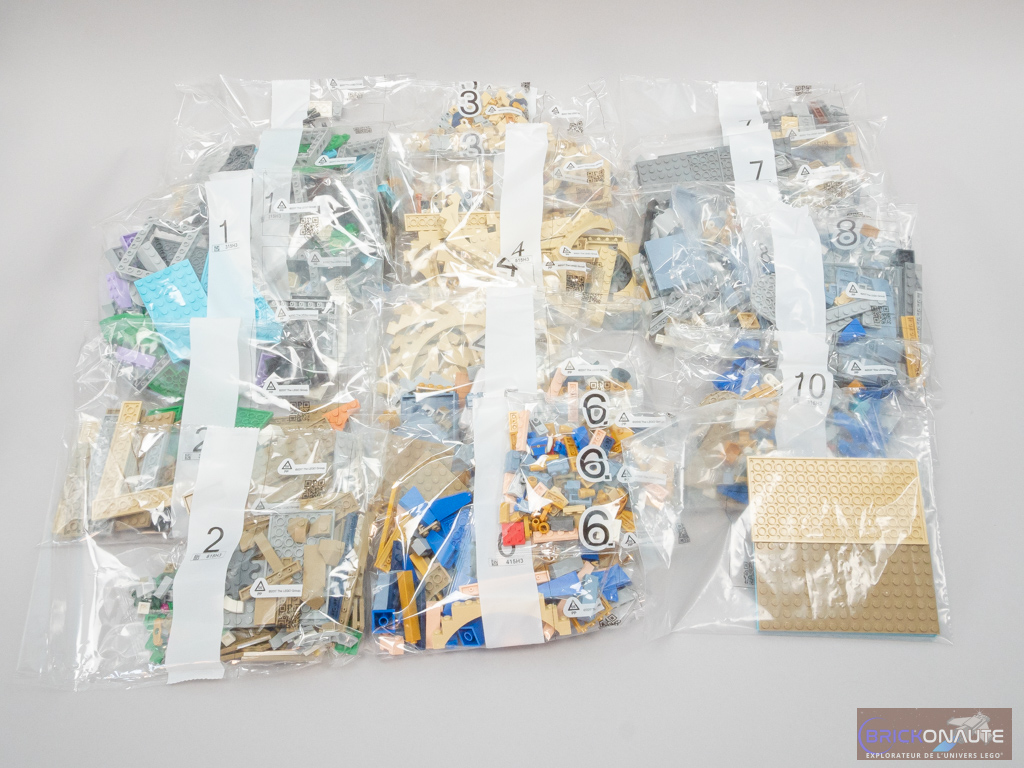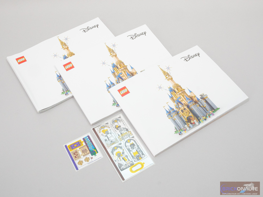 À l’intérieur, on trouve 38 sachets numérotés de 1 à 25 et un dernier sachet non numéroté. Les instructions sont séparées en 3 notices distinctes (244, 208 et 304 pages), pour un total de 1017 étapes de construction. Étrangement, les notices ne sont pas numérotées. La première notice comporte quelques pages sur la genèse du set, les différentes références qu’il contient, et un petit mot de son designer. On trouve enfin 2 planches de stickers pour un total de 11 autocollants. Même s’ils ne sont pas nombreux, c’est toujours aussi gênant dans un set vendu à 400 €.