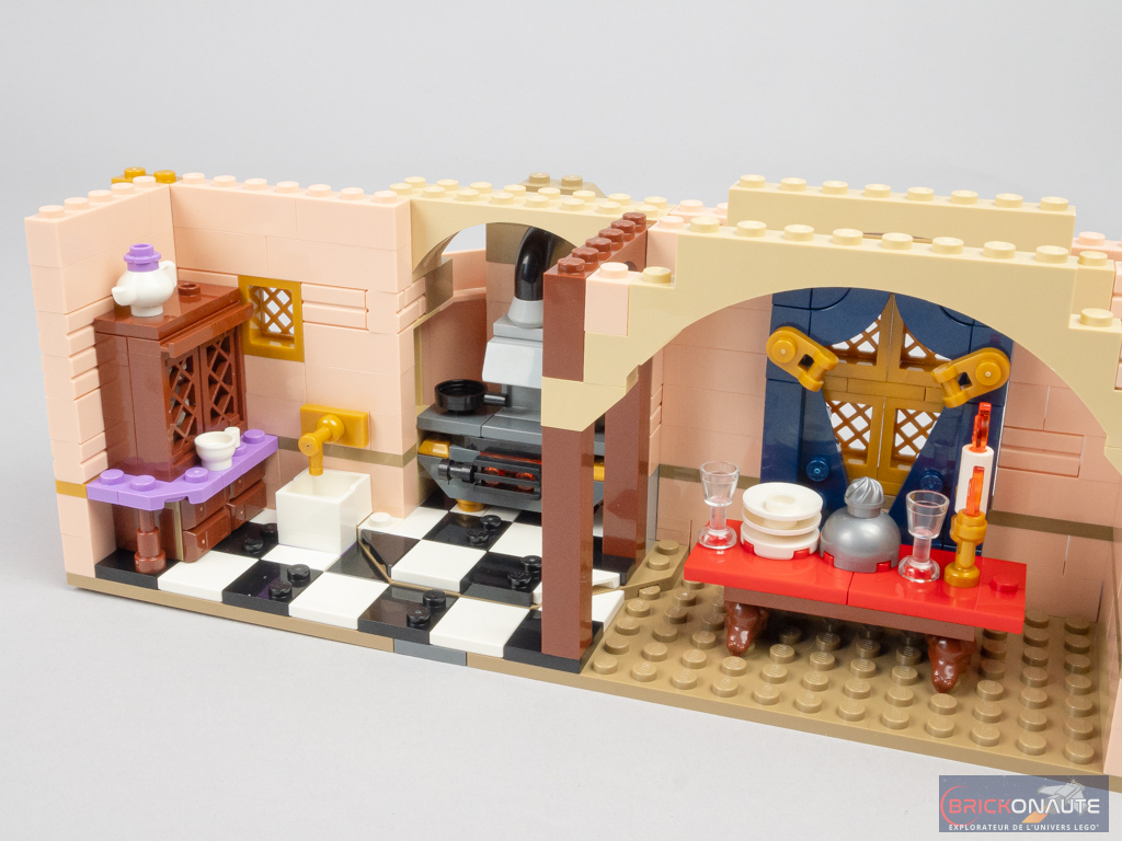 On élève les murs en ajoutant également quelques fenêtres, et des créneaux dorés à l’extrémité. On s’intéresse surtout à l’intérieur avec l’aménagement de la cuisine de La Belle et la Bête avec une table, de la vaisselle et un chandelier, de jolis rideaux dark blue, un robinet doré et un vaisselier, avec des petites round plates en guise d’assiettes. C’est franchement réussi.