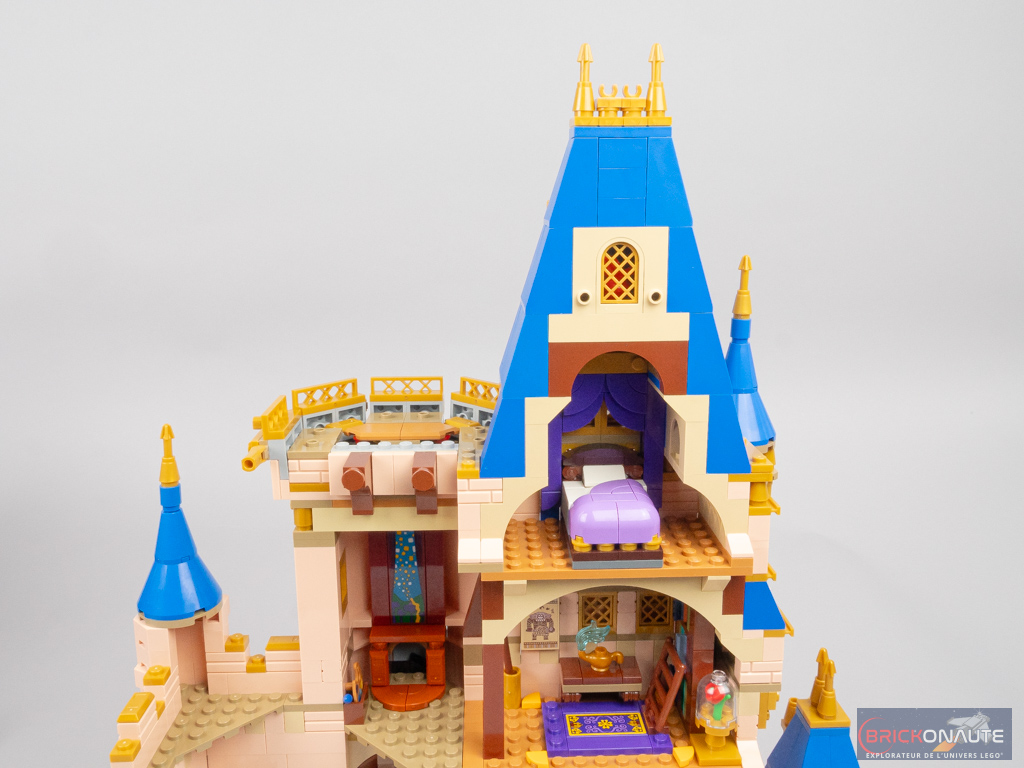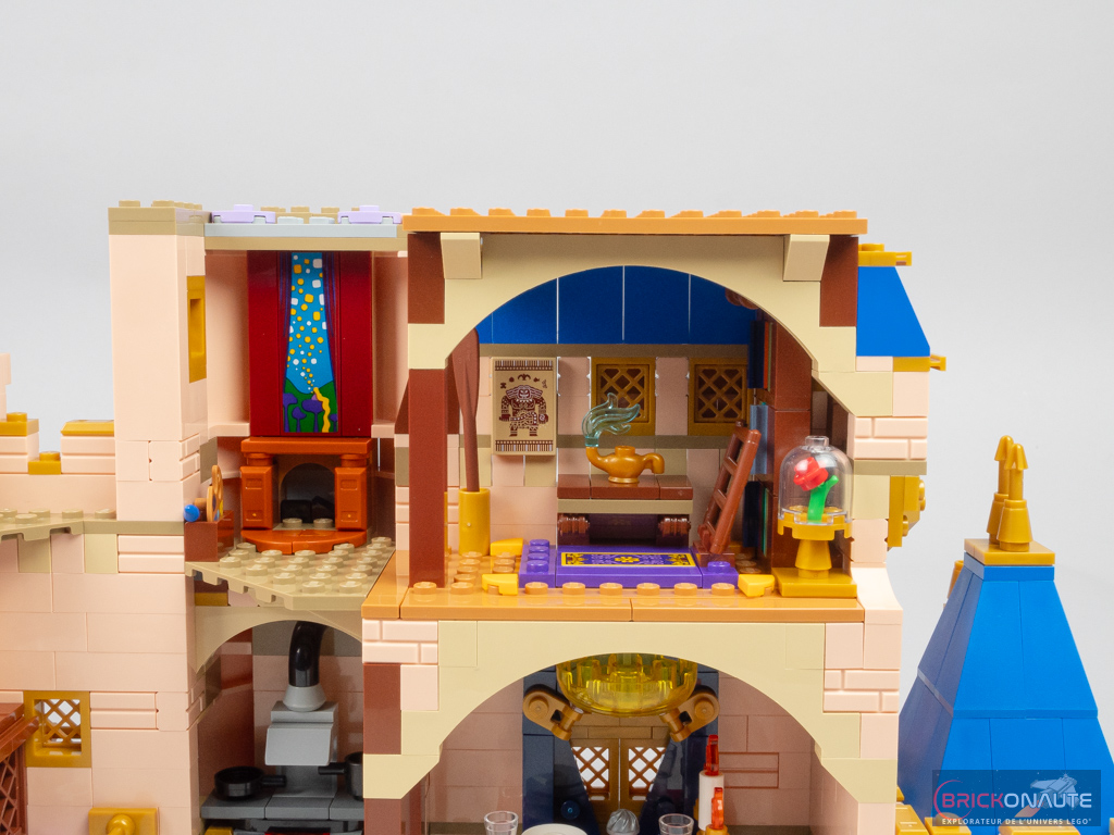 On passe au niveau supérieur où on élève les murs, on ajoute des fenêtres et on constitue de petites tourelles de part et d’autre. Côté intérieur, on retrouve plein de références avec Raiponce (2010), sa palette et son ciel où volent des lanternes ; Aladdin (1992) avec un tapis volant et une lampe magique, Vaiana (2016) avec une pagaie et un ornement mural ; et encore La Belle et la Bête avec une bibliothèque et la rose sous sa cloche de verre.