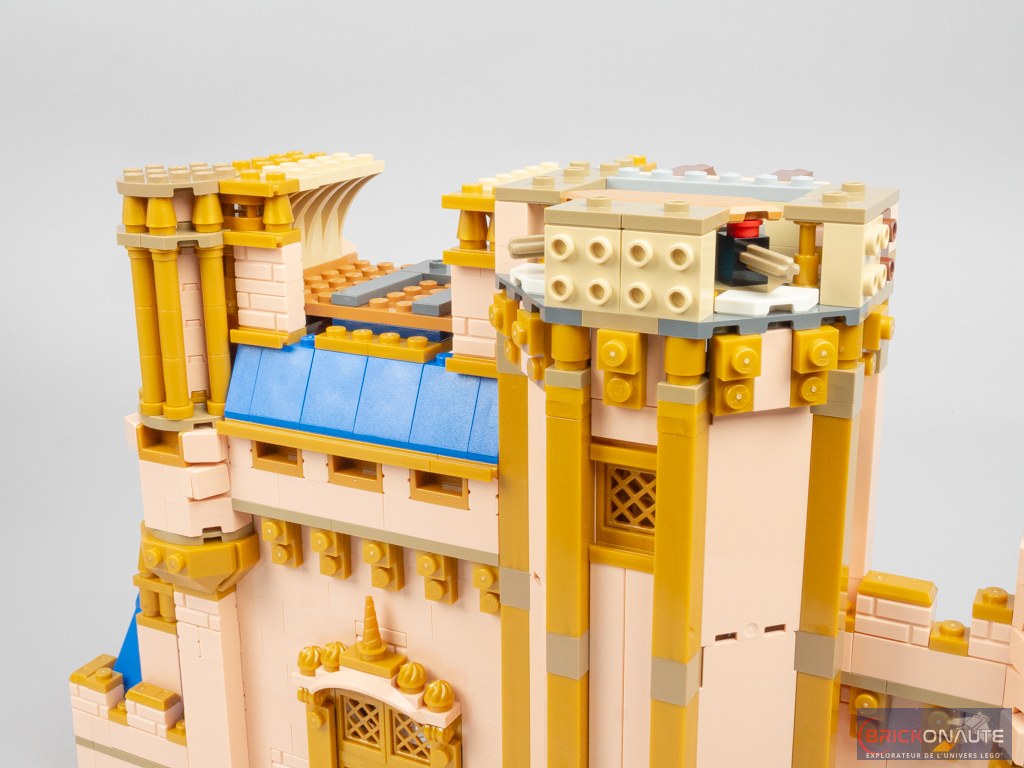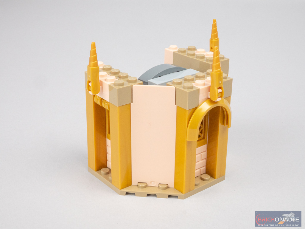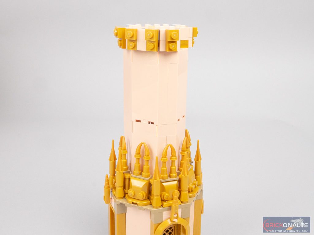 On ajoute ensuite un nouveau niveau, ouvert, à cette tour. Petite prouesse technique, la tourelle fixée dans l’angle utilise une technique bien pensée, avec un axe Technic dans la structure, qui permet de fixer la pointe inférieure orientée vers le bas. Les petites colonnettes sont réalisées avec des bougies superposées. Là encore, on ajoute une collection de petits éléments dorés en décoration.