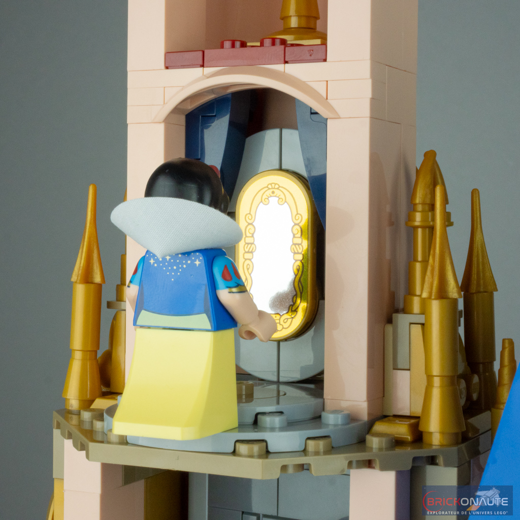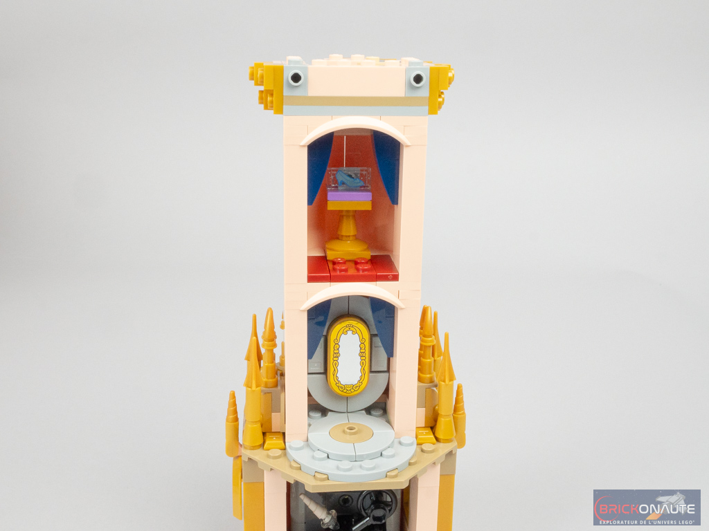 La section se réduit sur les deux niveaux suivants, où les murs extérieurs de la tour sont simplement constitués de panels à 45 degrés placés côte à côte. On ajoute de nombreuses décorations dorées sur le toit du premier niveau, c’est plutôt réussi. À l’intérieur, deux nouvelles références à des films Disney avec le miroir de Blanche-Neige et les Sept Nains, et la pantoufle de verre sur un présentoir de Cendrillon (1950) – j’en profite pour dire que je trouve les références à ce dernier film un peu légères, avec la citrouille, cette pantoufle de verre et 2 minifigs – surtout qu’il s’agit précisément du château de Cendrillon…
