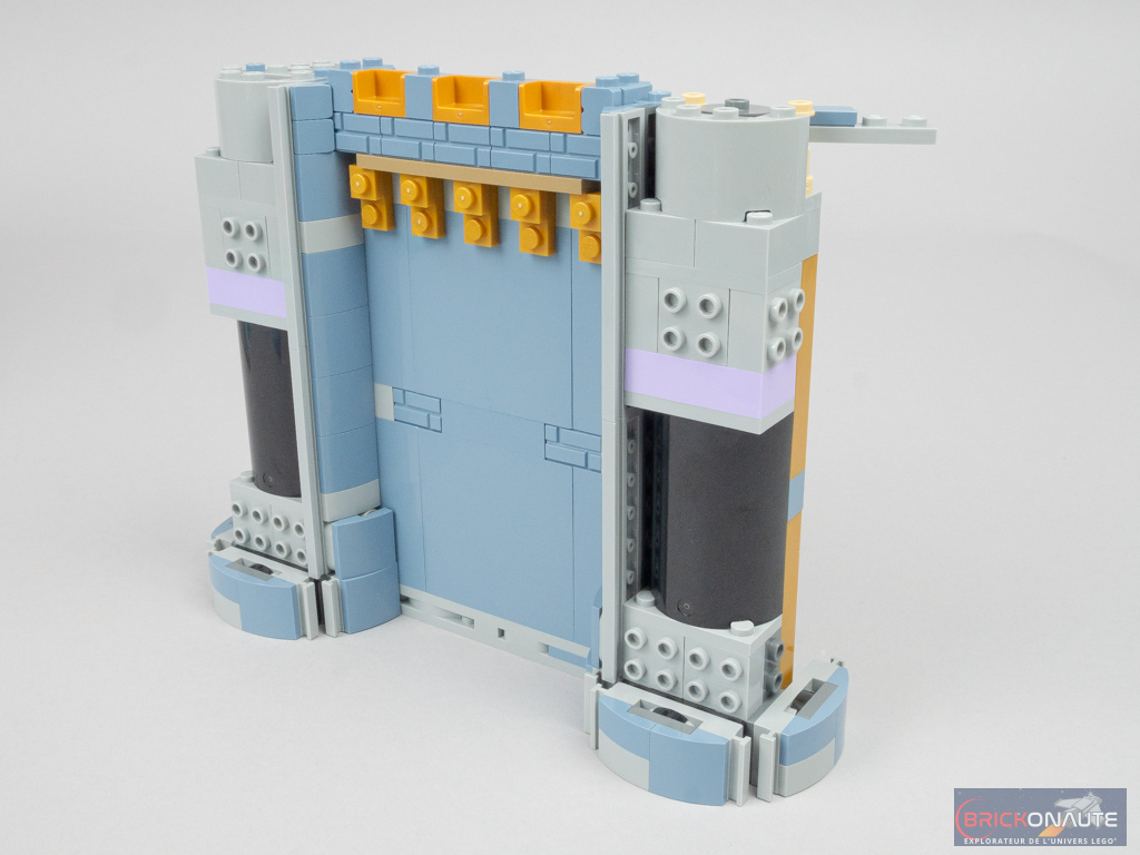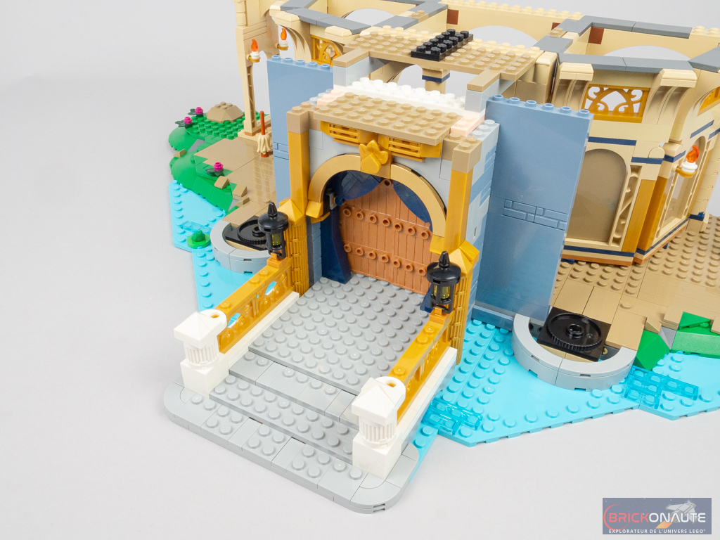 Nous passons ensuite à l’entrée du château, avec de chaque côté des deux portes (fixées sur des clips) des grands murs sand blue. Autour de la porte, un joli travail est fait sur les rideaux – la partie supérieure est clipsée pour obtenir l’angle désiré. On ajoute deux belles lanternes construites « à l’envers », et une collection de pièces dorées tout autour. Juste un petit regret au sujet de ces éléments dorés : les pièces teintées dans la masse sont moins brillantes que celles qui sont laquées – mais ces dernières sont plus sujettes aux rayures. Il en résulte une différence de rendu.