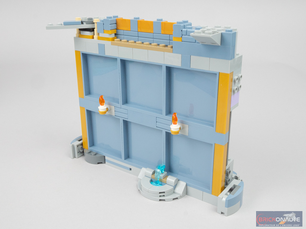 On s’attaque ensuite au sous-assemblage qui formera les deux tours situées à gauche. La portion de mur est constituée de grands panels sand blue avec quelques éléments intercalés entre deux rangées. Pour les tours, on assemble une structure à base de briques SNOT, qu’on vient ensuite couvrir de sous-ensembles aux formes arrondies – une technique classique chez LEGO pour reproduire les objets cylindriques comme les tours ou les fusées. Au-dessus des panels, on installe quelques créneaux dorés. Une petite turntable située en haut de la tour droite permettra de raccorder l’ensemble au château. Côté intérieur, une petite fontaine complète la référence à Fantasia.