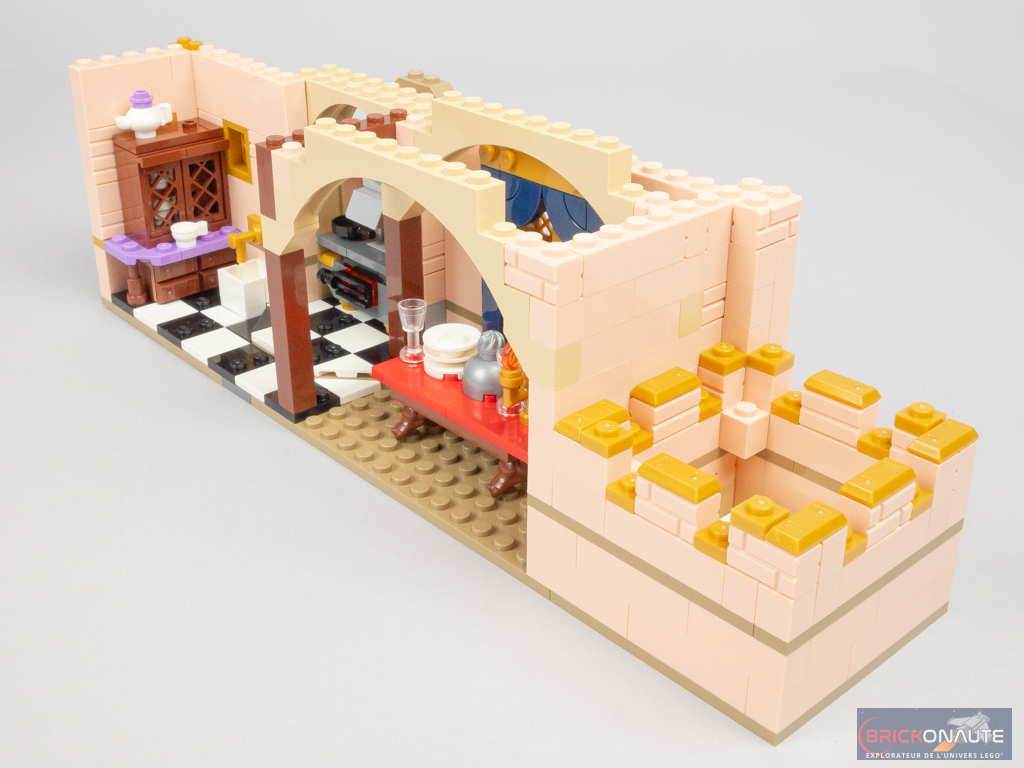 On élève les murs en ajoutant également quelques fenêtres, et des créneaux dorés à l’extrémité. On s’intéresse surtout à l’intérieur avec l’aménagement de la cuisine de La Belle et la Bête avec une table, de la vaisselle et un chandelier, de jolis rideaux dark blue, un robinet doré et un vaisselier, avec des petites round plates en guise d’assiettes. C’est franchement réussi.