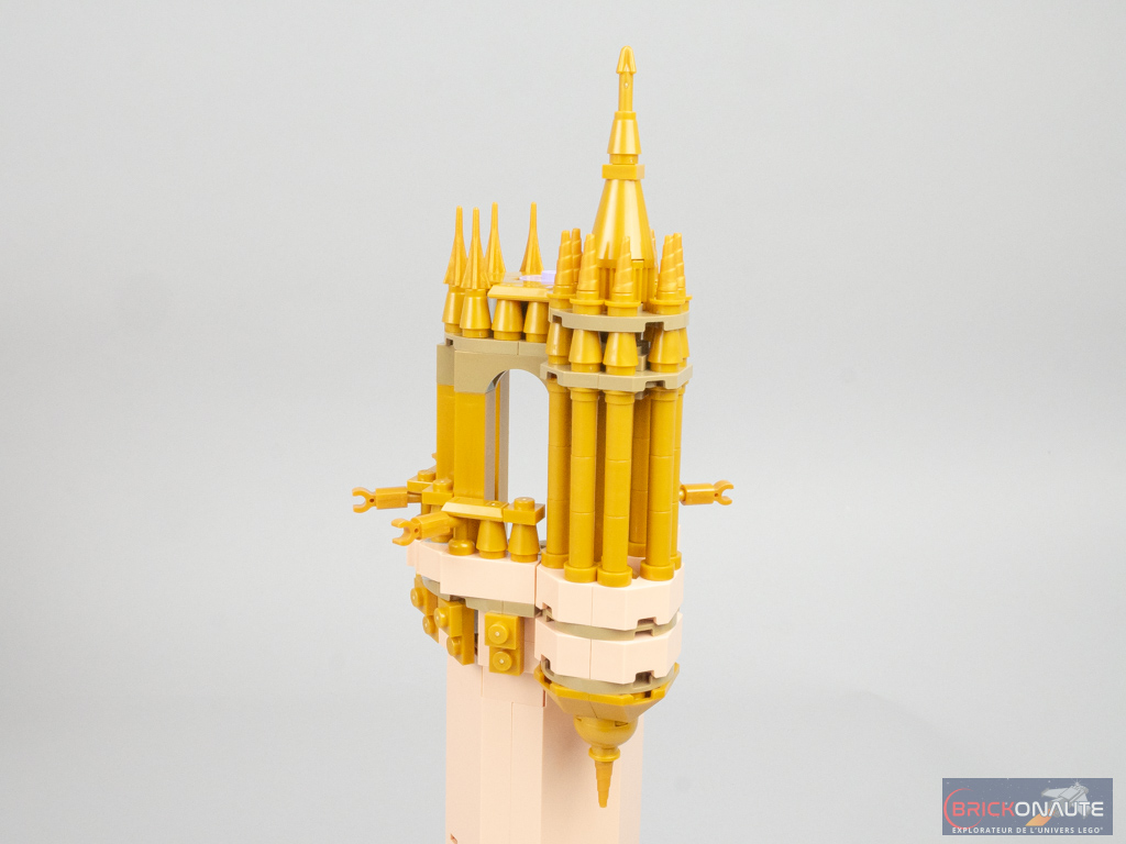 On ajoute ensuite un nouveau niveau, ouvert, à cette tour. Petite prouesse technique, la tourelle fixée dans l’angle utilise une technique bien pensée, avec un axe Technic dans la structure, qui permet de fixer la pointe inférieure orientée vers le bas. Les petites colonnettes sont réalisées avec des bougies superposées. Là encore, on ajoute une collection de petits éléments dorés en décoration.