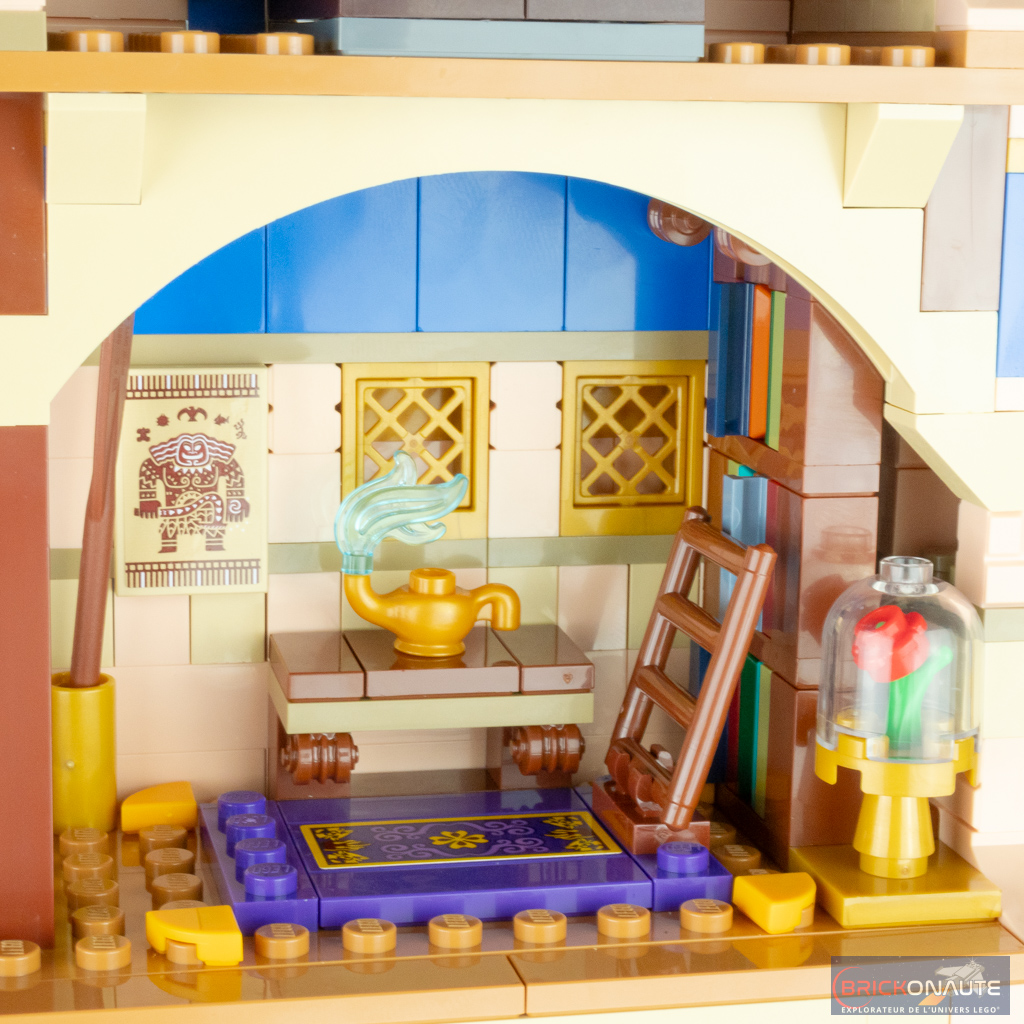 On passe au niveau supérieur où on élève les murs, on ajoute des fenêtres et on constitue de petites tourelles de part et d’autre. Côté intérieur, on retrouve plein de références avec Raiponce (2010), sa palette et son ciel où volent des lanternes ; Aladdin (1992) avec un tapis volant et une lampe magique, Vaiana (2016) avec une pagaie et un ornement mural ; et encore La Belle et la Bête avec une bibliothèque et la rose sous sa cloche de verre.