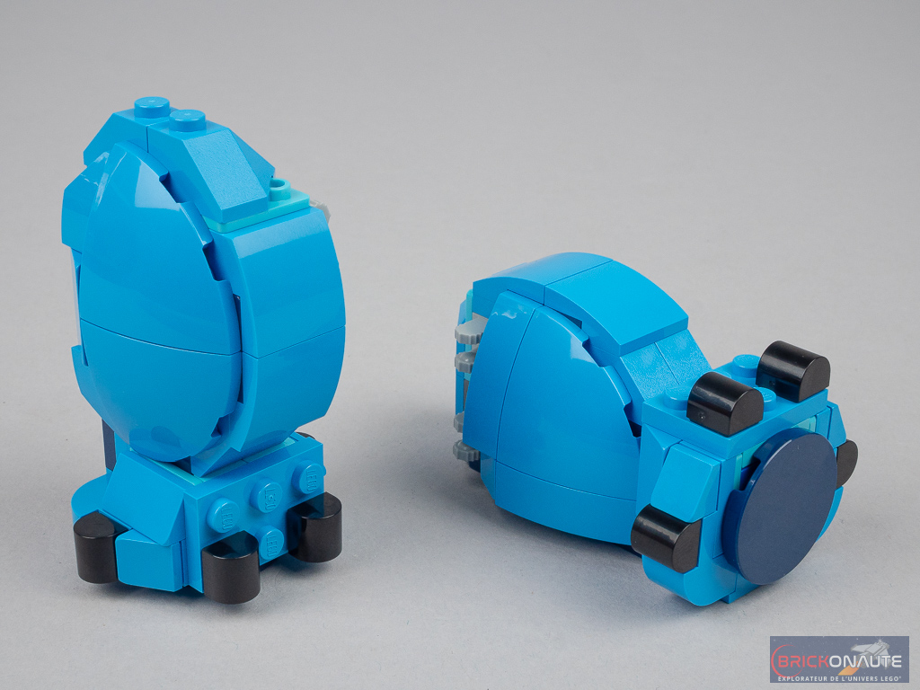 On passe ensuite à la construction des pattes arrières – il s’agit ici encore d’une structure SNOT habillée sur ses différentes faces de pièces bleues. On les fixe au torse sur des charnières à cliquet qui permettent de trouver l’angle désiré, elles ne seront cependant pas mobiles.