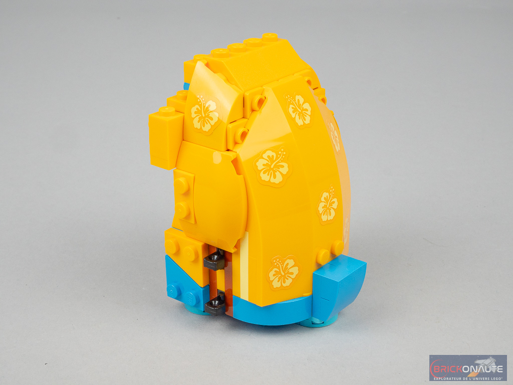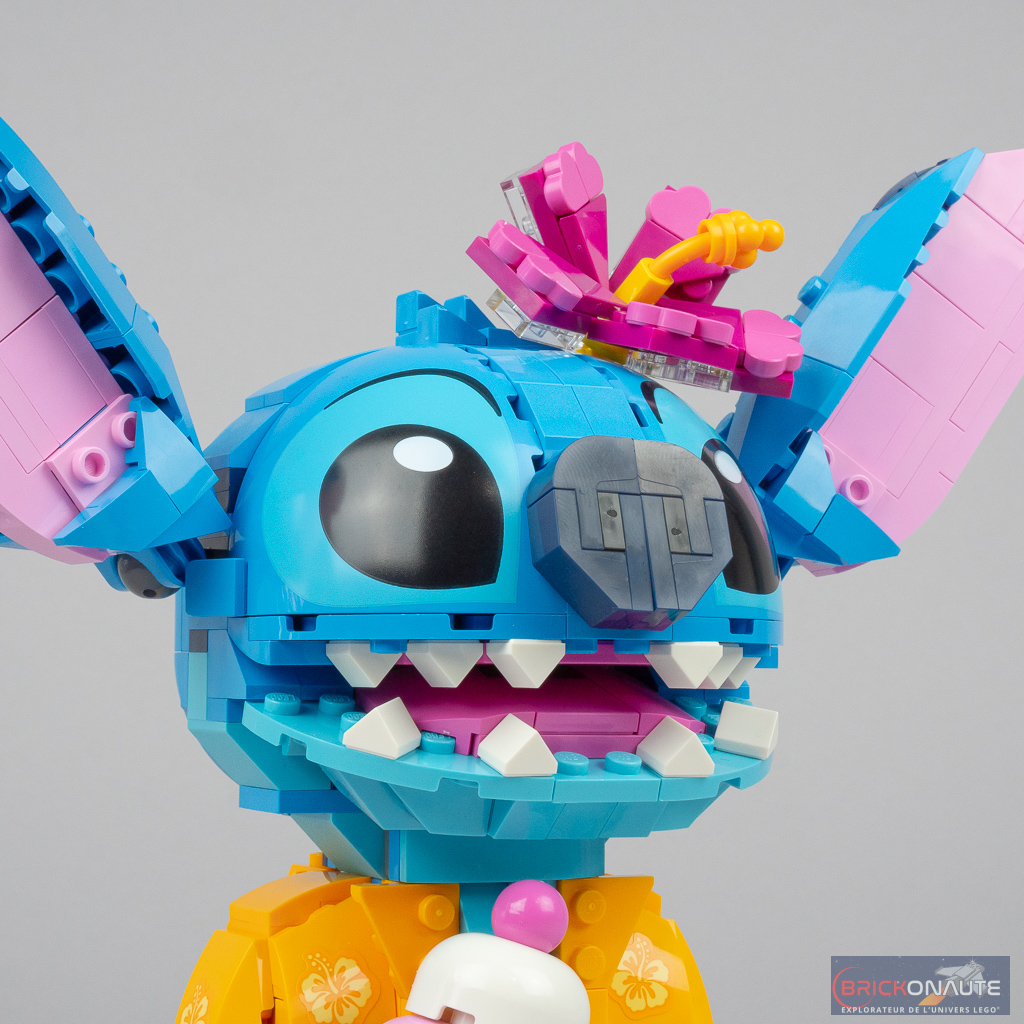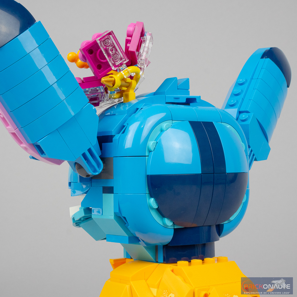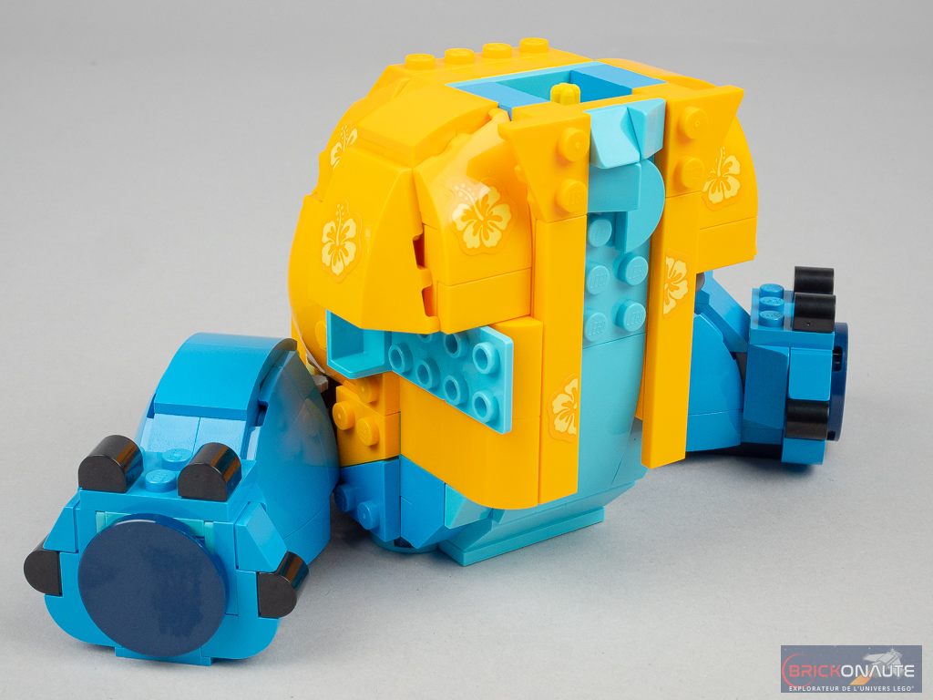 C’est d’ailleurs probablement le principal défaut de cette boîte, estampillée « 9+ », que LEGO nous vend de la manière suivante « Les enfants créent leur propre Stitch avec une chemise hawaïenne, une fleur et une glace, puis jouent avec ou décorent leur chambre. » En l’état, ils ne pourront pas vraiment jouer avec puisque les mobilités offertes sont peu nombreuses : la tête tourne et les oreilles sont orientables… et c’est tout. Cet avis n’engage que moi mais en l’état, cette boîte semble plus destinée à un public adulte qu’à un(e) jeune fan de l’Expérience 626.