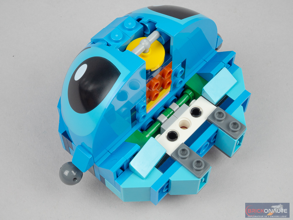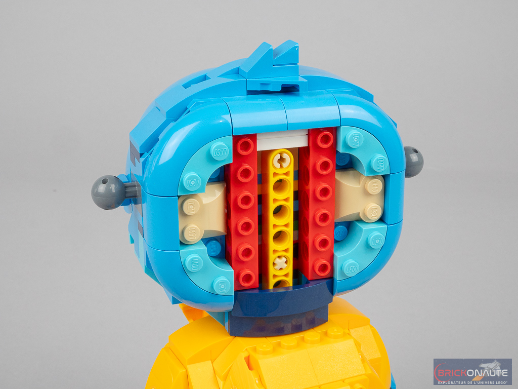 La construction de la tête repose sur une structure centrale, d’une largeur de 2 tenons, à base d’éléments SNOT et de deux gros ball joints pour la fixation des oreilles. On y attache les deux grands quarts de dôme tampographiés pour les yeux.