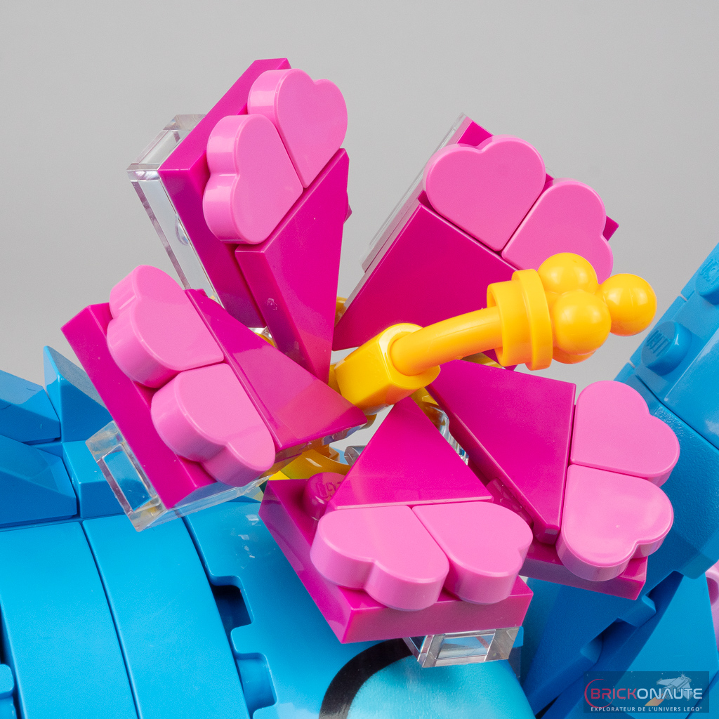 LEGO a fait le choix d’employer de grands quarts de dôme tampographiés pour les yeux et pour le coup, c’était probablement la bonne solution, et la tampographie est impeccable. La fleur fixée sur sa tête est également bien réalisée.