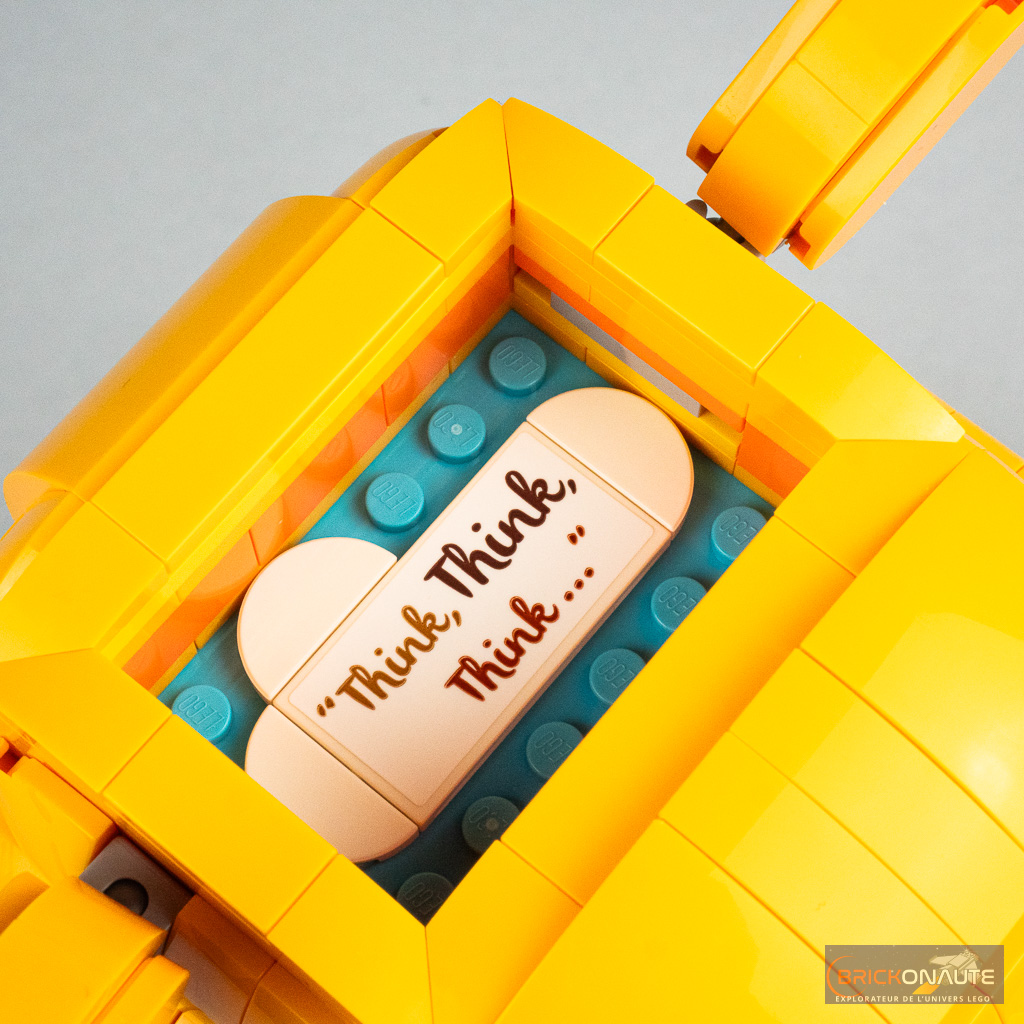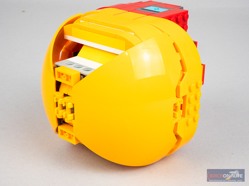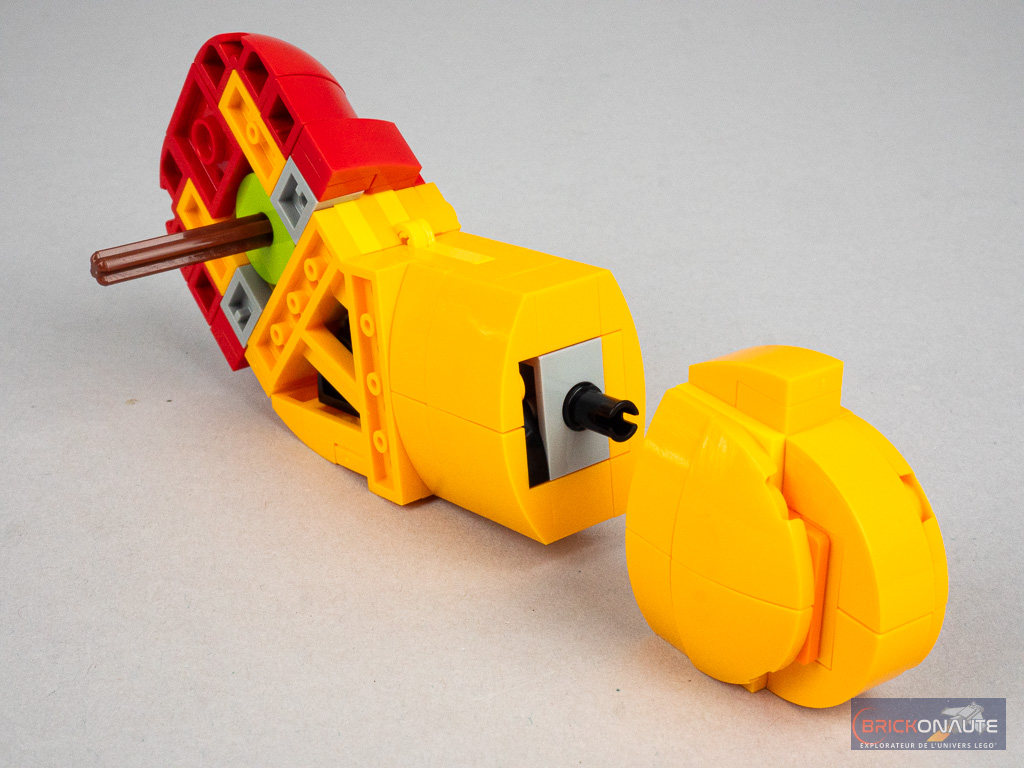 On construit ensuite les jambes (fixes et attachées au corps avec des pins), et les pieds qu’on peut tourner sur leur axe. On complète la partie haute du corps (avec la petite scène interne cachée dans le torse) avant d’assembler les bras faisant appel à des charnières et des pièces en angle. Ils sont attachés sur un axe Technic lui-même attaché à un ball joint et sont donc mobiles, uniquement du bas vers le haut. Les mains sont attachées sur un pin et donc également orientables.