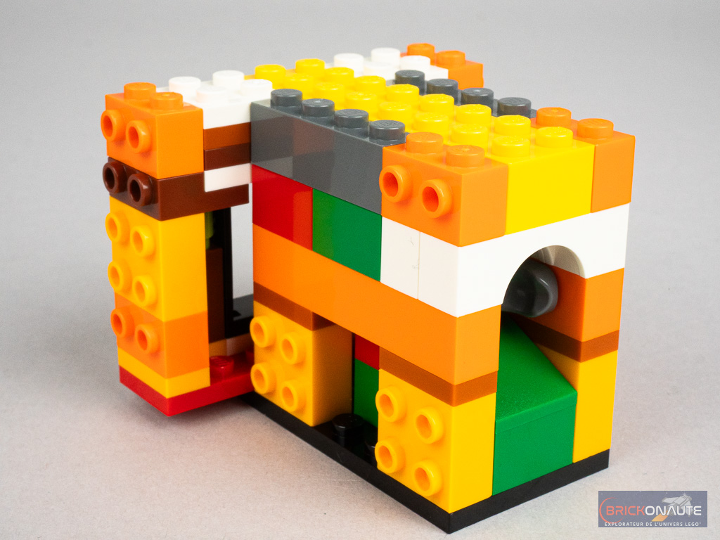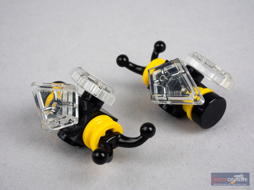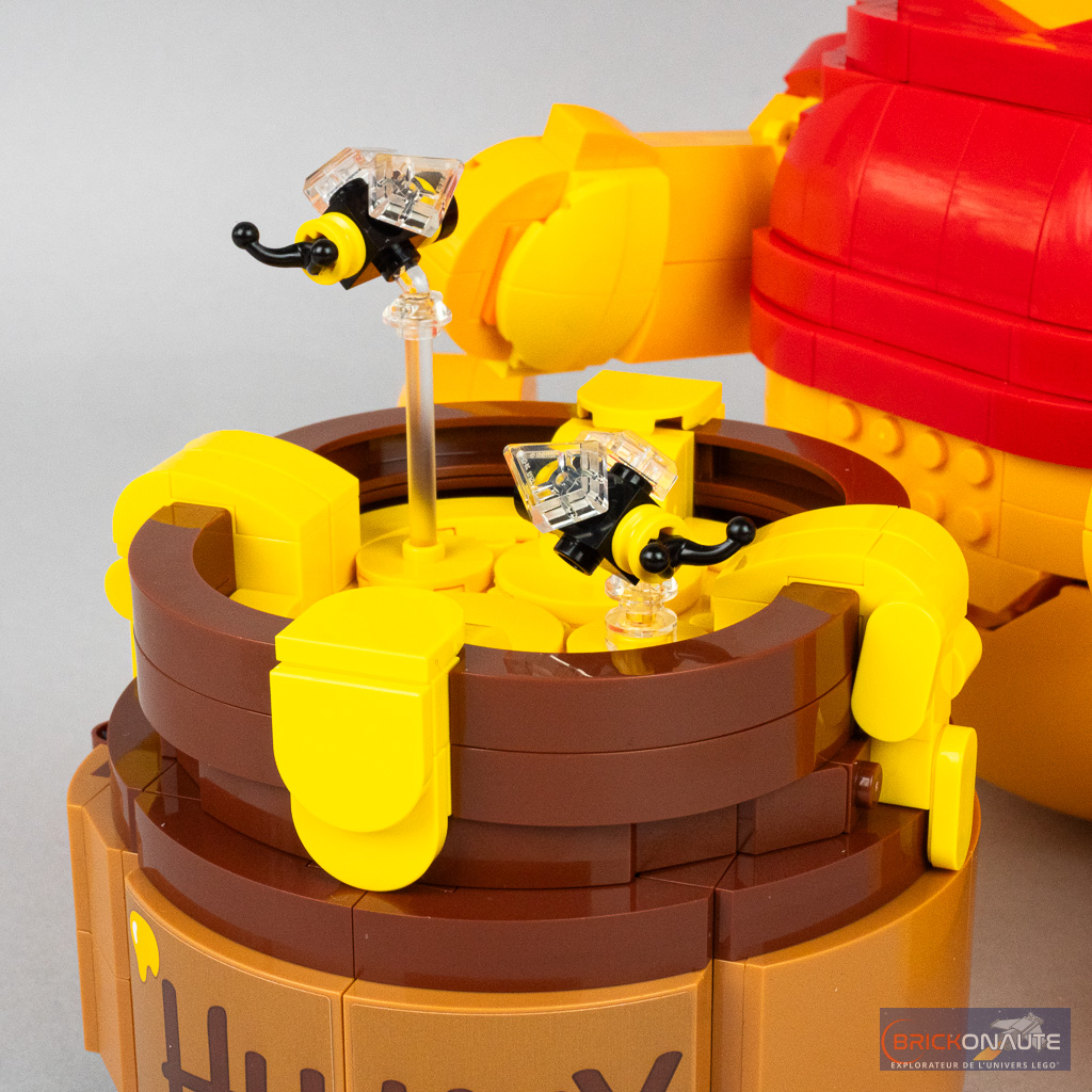 Rien de très compliqué pour l’assemblage du pot de miel en deux parties avec une structure d’éléments SNOT couverte de pièces courbes, et une articulation à base d’éléments Technic. En partie supérieure, on ajoute quelques éléments jaunes pour le miel et deux jolies abeilles qui, si elles n’utilisent que 8 pièces chacune, sont plutôt réussies.