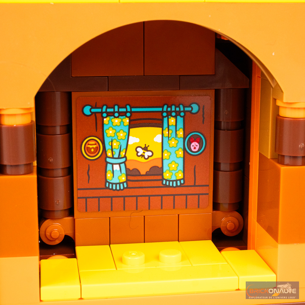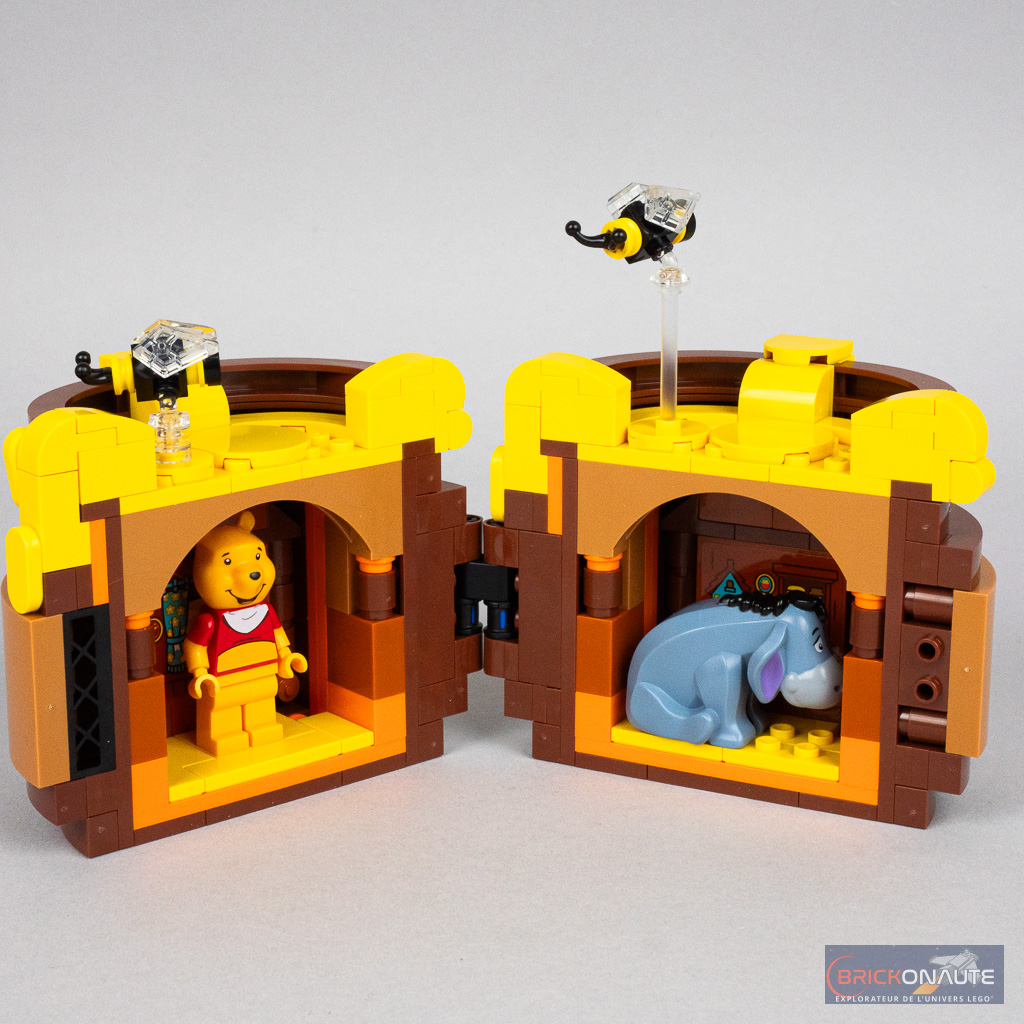Deux petites abeilles, symboliques mais bien fichues, survolent le pot de miel qui s’ouvre pour dévoiler deux petits « décors » intérieurs – des décors qui se limitent à des autocollants mais que LEGO nous vend comme « 2 pièces » dans le descriptif officiel. Ces « pièces » serviront surtout à y installer les deux personnages fournis, une minifig de Winnie et Bourriquet.
