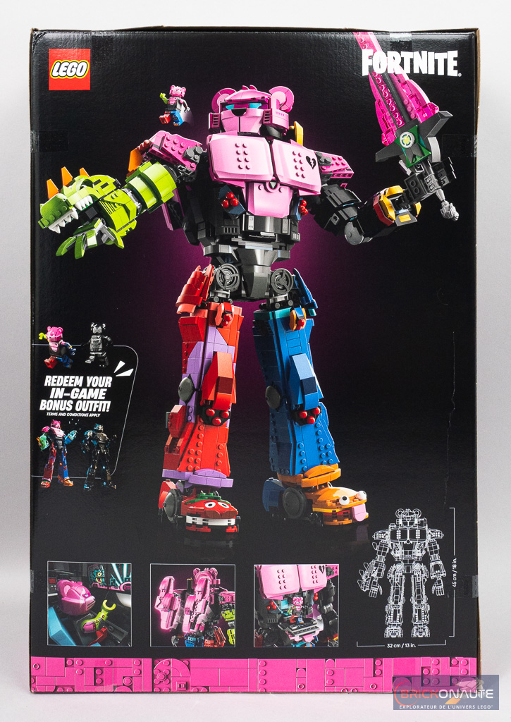 La grosse boîte reprend le look habituel des sets dédiés aux fans adultes, avec une présentation sobre du set sur fond noir – une bande rose reprenant ici les principales informations le concernant. Au dos, on découvre qu’il sera possible de récupérer une tenue dans le jeu vidéo Fortnite grâce à cette boîte. On y trouve également le robot dans une autre position, quelques vignettes de détail, et un schéma nous précisant ses dimensions : 45 cm de haut pour 32 cm de large tout de même !