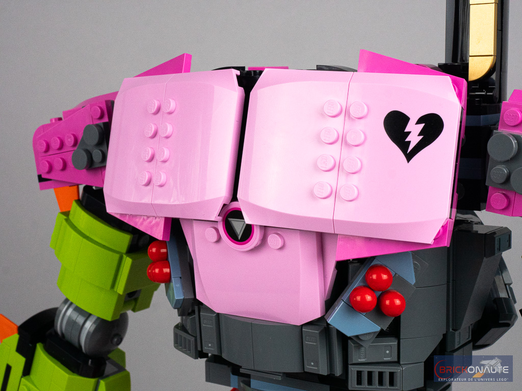 Après environ 5 heures de construction sans se presser, on obtient donc ce gros robot de 45 cm de haut, plutôt impressionnant par sa carrure et, c’est difficile de s’en rendre compte sur les photos, par son poids. Et on ne pourra pas lui retirer une chose : le design est particulièrement original, sorte « d’assemblage » de différents personnages de l’univers comme l’experte des câlins (pour la tête et le torse), le Durr Burger, le Beef Boss ou Drift.