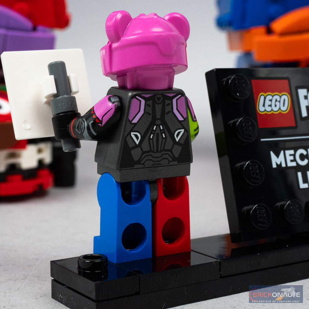 LEGO a pris l’habitude de livrer certaines de ses références « pour adultes » avec une petite plaque de présentation et le set qui nous intéresse aujourd’hui ne fait pas exception à la règle, avec une plaque tampographiée du nom du set et du logo LEGO Fortnite. Elle dispose d’un petit emplacement pour y installer la seule minifig fournie, le Chef de l’équipe Mécha… alter ego miniature du robot donc.
