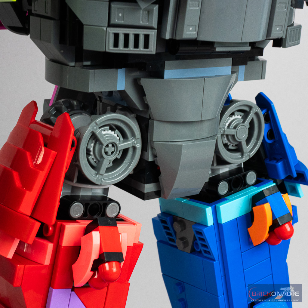 Par jambe, ce sont deux sachets de pièces qui sont nécessaires, et un troisième pour le pied. On commence par assembler une structure SNOT avant de la décorer sur ses différentes faces, puis de la fixer au corps du robot. Les pieds sont assemblés à part et l’angle est ajustable au niveau de la cheville, grâce à des éléments à cliquets assurant une certaine rigidité. Pour éviter que le robot ne glisse sur l’étagère sur laquelle il sera posé, des patins et des pneus sont disposés sous les pieds.