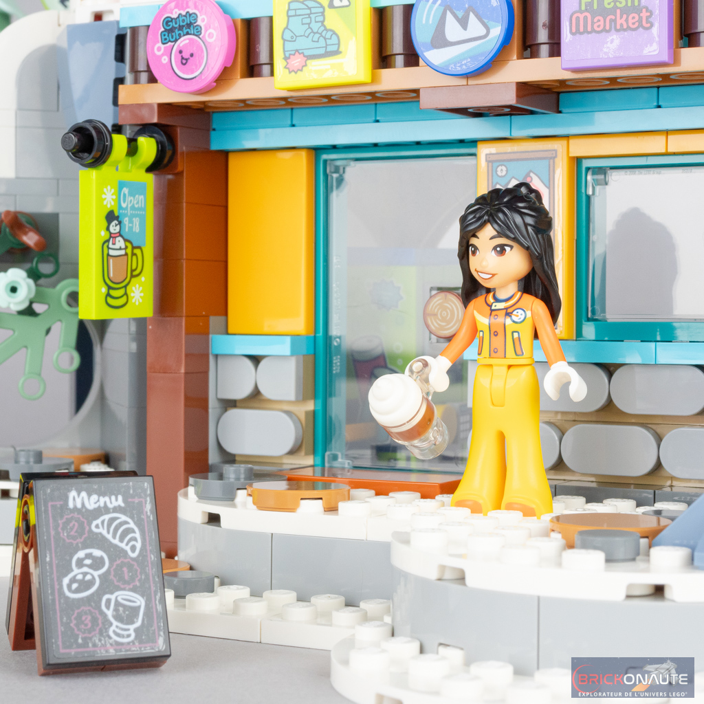 La construction est presque terminée. Le dernier sachet de pièces est dédié à l’ajout de nombreux accessoires et décorations : des arbres, de la végétation, un banc, une table, des chocolats chauds, des skis et des bâtons, et un petit écriteau avec le menu.