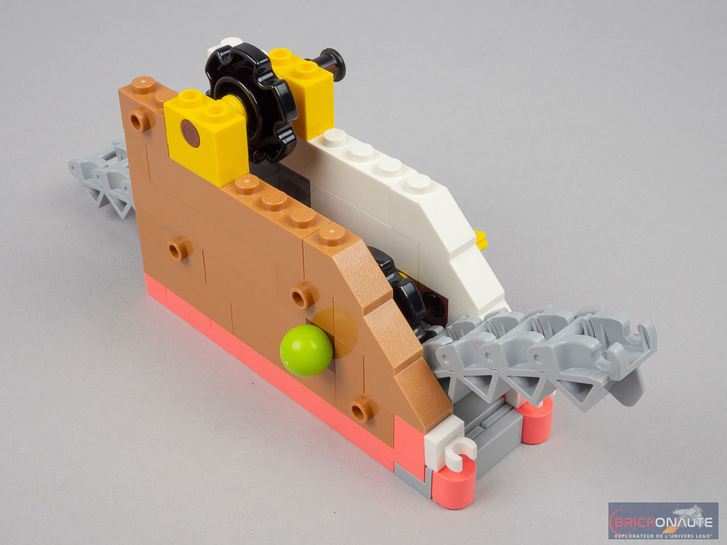 Techniquement, l’étape qui suit est l’une des plus intéressantes : les escalators. Il s’agit ici de pièces spécifiques « chaînées » et entraînées par deux grosses roues noires. Côté arrière, on construit un système irréversible avec un engrenage et une vis sans fin pour entraîner l’ensemble. On attache ce sous-ensemble sur le 1er étage, et on construit également le plancher au-dessus du magasin de jardinage.