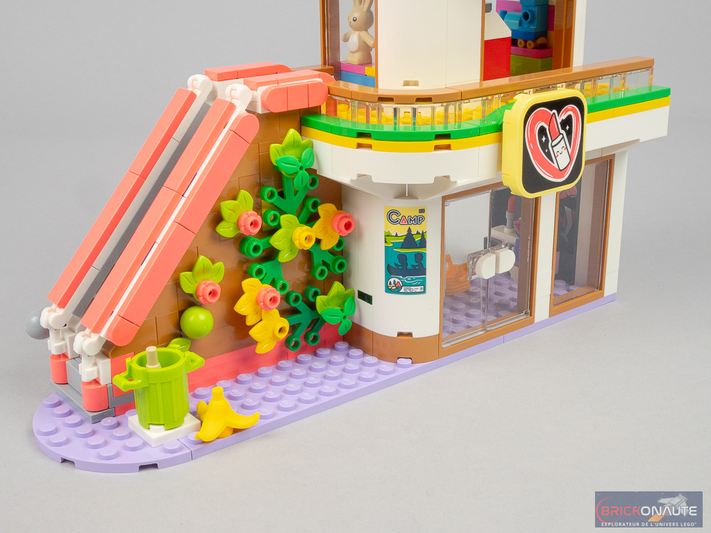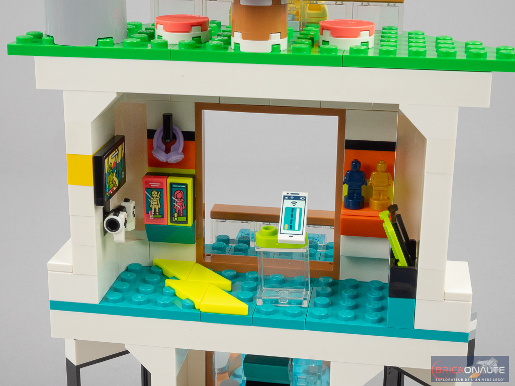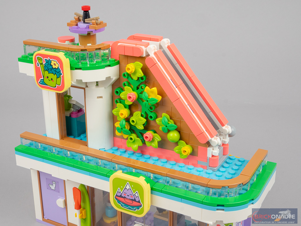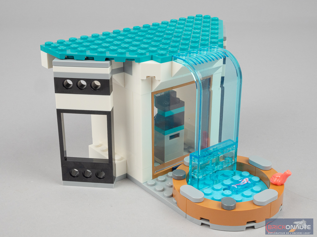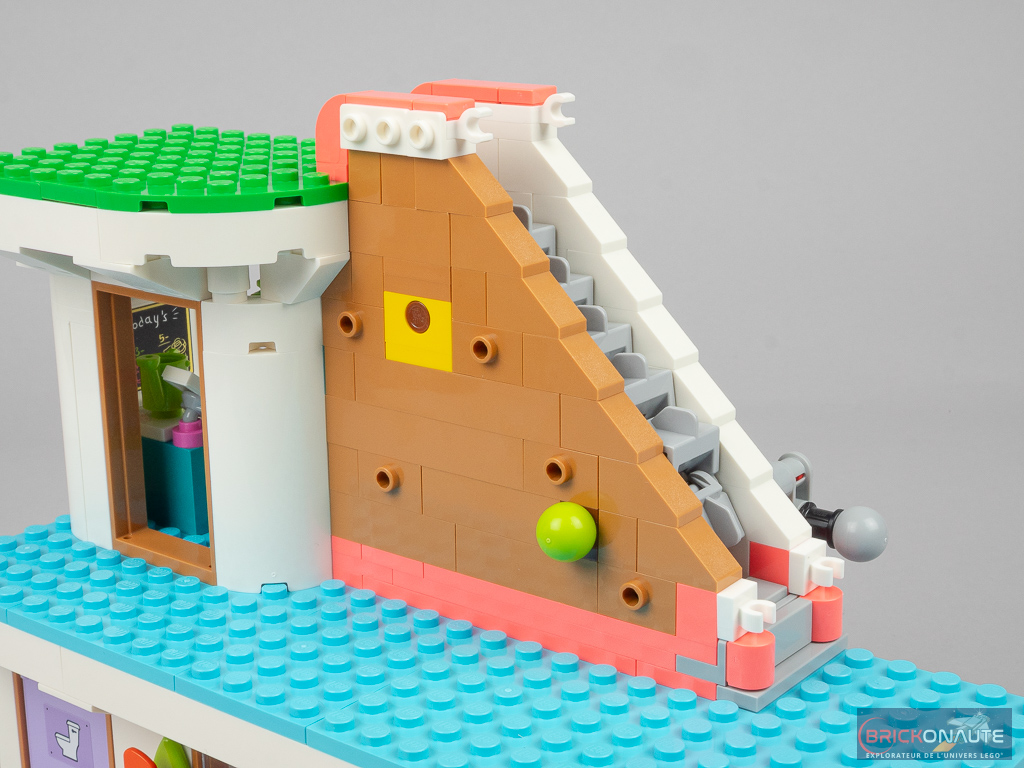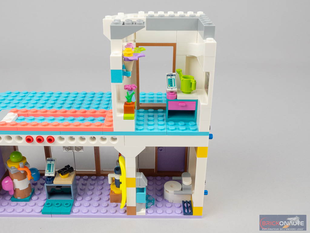 Côté design extérieur, c’est un peu trop bariolé à mon goût. J’apprécie cependant le niveau de détail, c’est très propre – mention spéciale pour ces jolies rambardes fixées sur des éléments transparents qui viennent longer les niveaux supérieurs, et pour la petite cascade et le bassin au niveau inférieur. Dans la conception, j’aime aussi beaucoup la réalisation des différents niveaux en encorbellement. J’aurais par contre aimé une jonction plus propre entre les 3 éléments principaux : un petit vide reste visible entre ceux-ci.