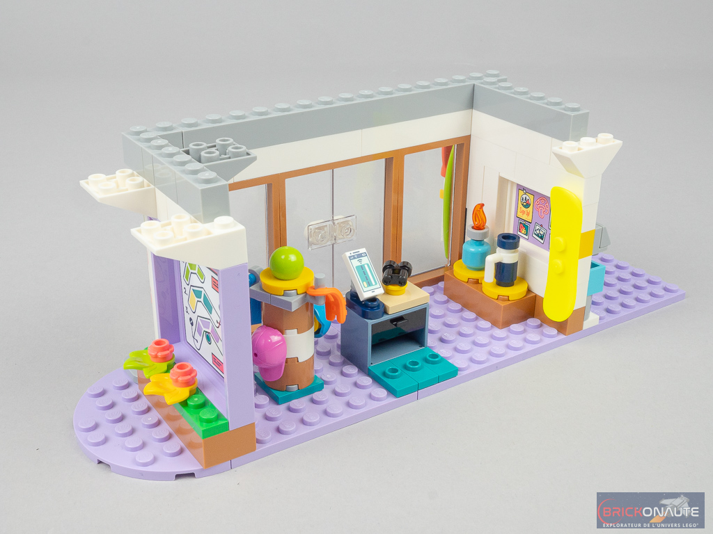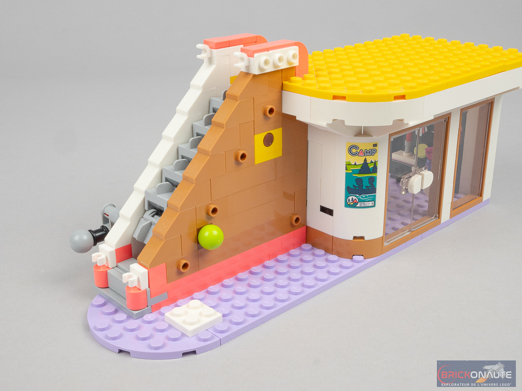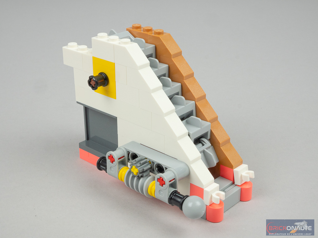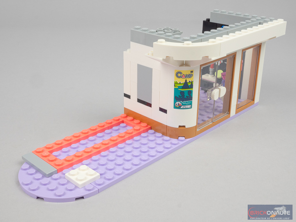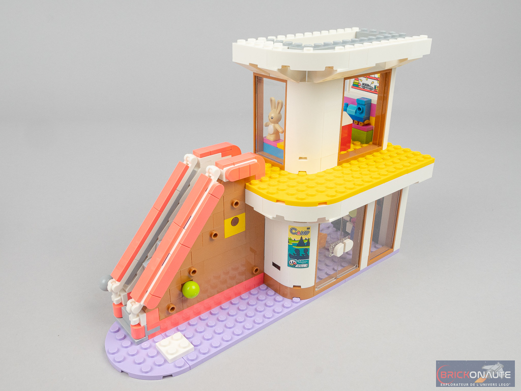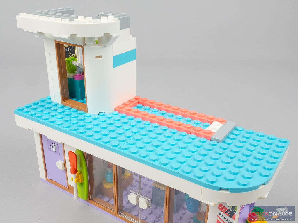 Côté design extérieur, c’est un peu trop bariolé à mon goût. J’apprécie cependant le niveau de détail, c’est très propre – mention spéciale pour ces jolies rambardes fixées sur des éléments transparents qui viennent longer les niveaux supérieurs, et pour la petite cascade et le bassin au niveau inférieur. Dans la conception, j’aime aussi beaucoup la réalisation des différents niveaux en encorbellement. J’aurais par contre aimé une jonction plus propre entre les 3 éléments principaux : un petit vide reste visible entre ceux-ci.