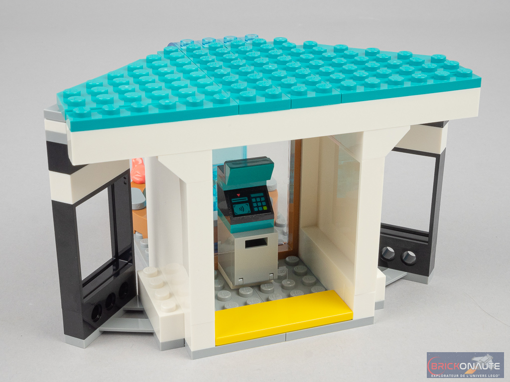 Le processus d’assemblage est plutôt plaisant : on alterne ici entre les équipements intérieurs des magasins, impeccablement réalisés, et la structure du bâtiment. Si la présence d’autocollants est malheureusement inévitable dans un set de ce type, certains sont particulièrement compliqués à appliquer correctement – notamment les plus grands à coller côté intérieur des panels.