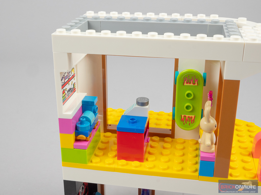 Au 1er étage, c’est un magasin de jouet qui s’est installé avec une peluche, un skateboard et une locomotive miniature. On remarquera dans l’autocollant au mur une référence au set LEGO Friends 42605 Mars Space Base and Rocket (mon test à cette adresse). On construit ensuite les deux rampes de l’escalator.
