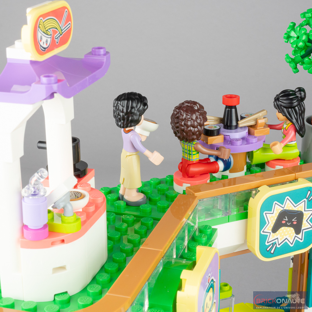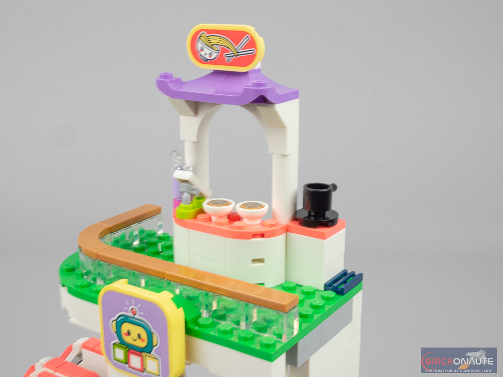On décore celui-ci avec un peu de végétation, puis on ajoute la rambarde au 1er étage et l’enseigne du magasin en-dessous. On construit le sol du 2ème niveau, et on y installe un stand de nouilles avec des bols et quelques accessoires. On termine avec la rambarde et l’enseigne au dernier niveau, avant de rassembler les 3 éléments principaux de la construction.