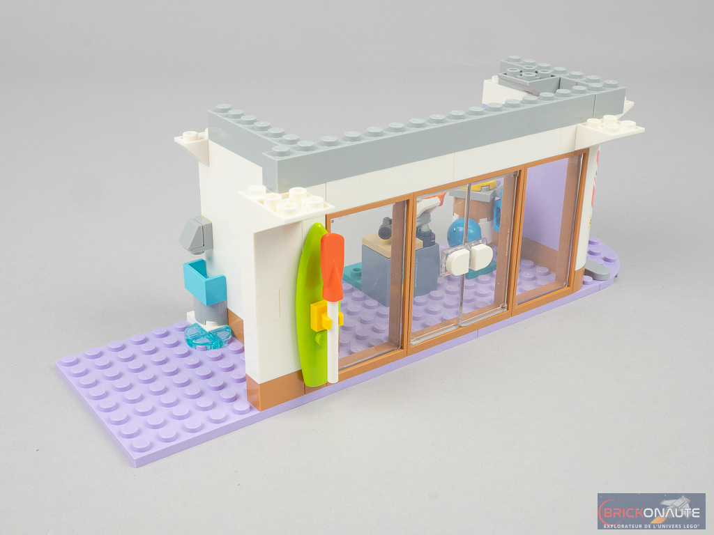 On s’attaque ensuite au centre commercial proprement dit, et plus précisément par le rez-de-chaussée de la partie droite. Un assemblage de grandes plates lavender constitue le sol et on aménage un grand magasin d’articles de sport avec un présentoir rotatif (sur une turntable), un petit comptoir, une bouteille de gaz, un thermos, une planche de surf – et une autre de paddle côté extérieur, à gauche de la grande vitrine. On commence aussi l’aménagement des toilettes, situés juste à côté.