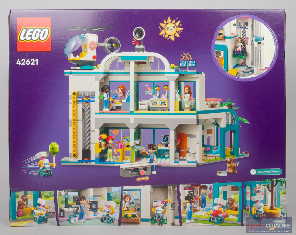 La boîte est plutôt grande pour un set de « seulement » 1045 pièces. Comme d’habitude dans la gamme, elle met en scène sur sa face avant les différents personnages qui vaquent à leurs occupations devant et dans ce grand hôpital. Au dos, on découvre l’intérieur de l’établissement et les nombreux détails qu’il propose. Plusieurs vignettes nous montrent quelques détails « macro », on découvre aussi sur l’une d’entre elles la fonctionnalité principale du set : un ascenseur fonctionnel sur une vis sans fin.