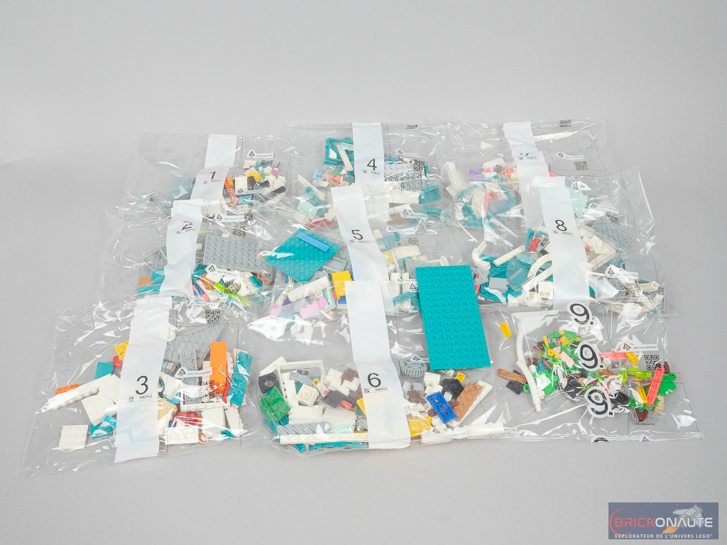 Après avoir découpé les scotchs, on trouve à l’intérieur de la boîte 9 sachets de pièces numérotés de 1 à 9 et une plate de 8×16 tenons de couleur teal (dark turquoise). Une pochette en carton contient la planche de 28 stickers et 2 notices d’instructions. La première, de 32 pages, est dédiée à la construction de l’hélicoptère à l’aide du 1er sachet de pièces. La seconde (260 pages) concerne la construction du bâtiment avec les sachets numérotés 2 à 9.