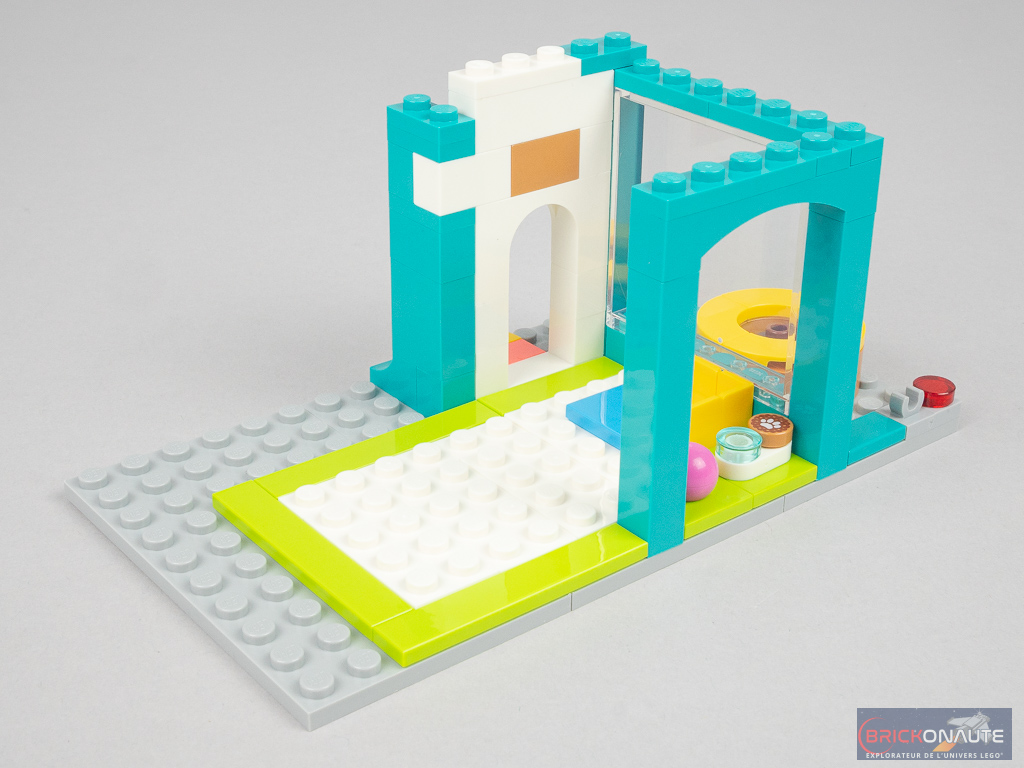 On s’attaque ensuite au vif du sujet avec l’hôpital à proprement parler. Et plus précisément on commence par la salle de thérapie pour le chien Rocky. On lui aménage un panier, et on lui donne également une gamelle avec des croquettes et de l’eau (identique à celle déjà vue pour le chat dans le set LEGO Friends 42605 Mars Space Base and Rocket dont je vous parlais récemment). Rocky sera libre d’aller et venir comme il le souhaite, par une petite porte spécialement aménagée pour lui.