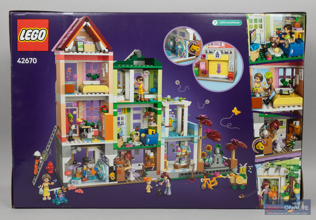 Sur la face avant de la boîte, on observe les différents personnages vaquer à leurs occupations dans ce quartier cossu d’Heartlake City. La météo est belle et on peut même apercevoir un rassemblement de montgolfières en arrière-plan. Une petite vignette, dans le coin supérieur droit, nous montre l’autre côté de la construction. On peut justement découvrir en détail l’intérieur des appartements et boutiques à l’arrière de la boîte. Plusieurs vignettes insistent sur certains détails et fonctionnalités.