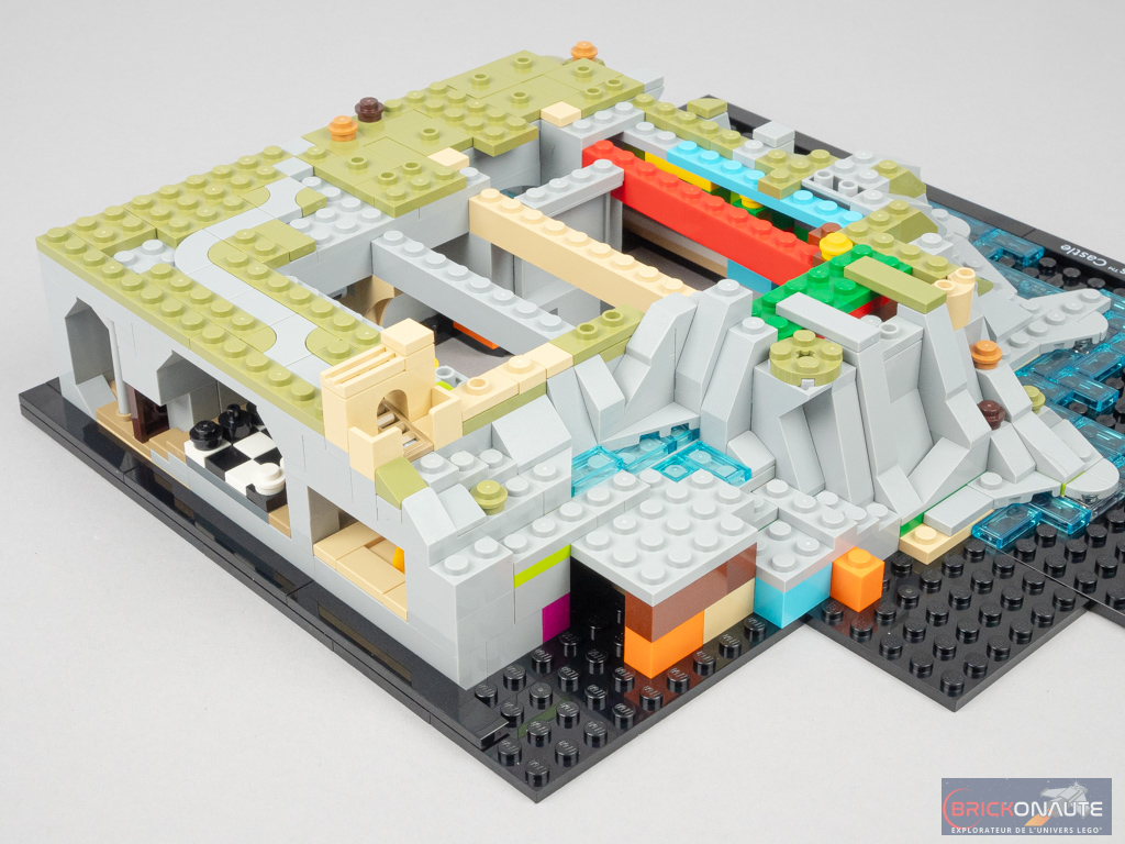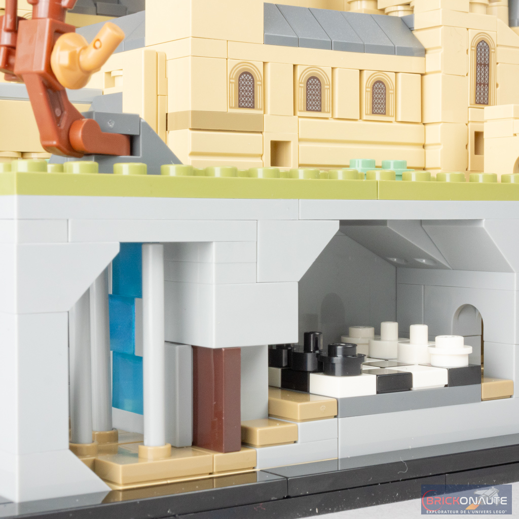 À l’intérieur de la boîte, on trouve 22 sachets numérotés de 1 à 22, ainsi qu’une plate noire de 16×16 tenons en vrac. Une pochette en carton contient les deux notices d’instructions (296 et 216 pages) : la première est dédiée au sous-sol et à la « base » du château, tandis que la suivante permet la construction des superstructures. Comme d’habitude dans ces sets dédiés aux adultes, la première notice commence par quelques pages sur la genèse du set et quelques mots de son designer, Yi-Chien Cheng.