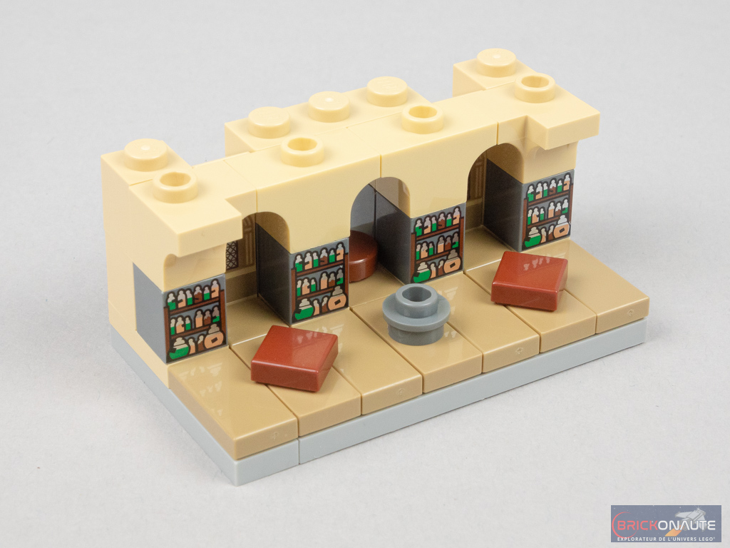 Notez qu’il n’y a aucun autocollant, toutes les pièces décorées sont donc tampographiées. On remarquera par exemple les petites fenêtres ou les potions au mur de la salle concernée. L’inventaire de 2660 pièces est particulièrement généreux, surtout pour un prix de 169,99 €. Ce positionnement en fait le set le moins cher de la gamme LEGO Harry Potter cette année en termes de prix / pièce (environ 0,064 €/pièce). Même s’il s’agit de beaucoup de petits éléments, le prix demandé me paraît donc tout à fait honnête.