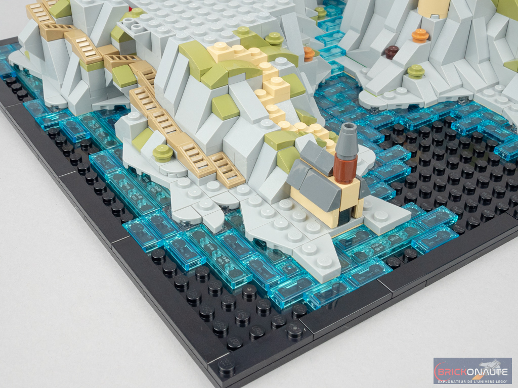 Le choix de couleurs est classique mais efficace. J’aime en particulier ici les liserés dark tan qui viennent souligner les parties qui auraient dû se trouver à l’ombre, l’utilisation de deux nuances de bleu pour l’eau du Lac Noir, et de quelques éléments transparents pour le bateau de Durmstrang qui en surgit. Notez également le liseré noir de la base et la plaque tampographiée « Hogwarts Castle » pouvant faire penser aux sets de la gamme LEGO Architecture.
