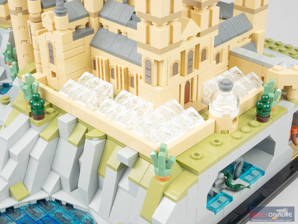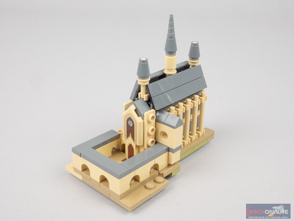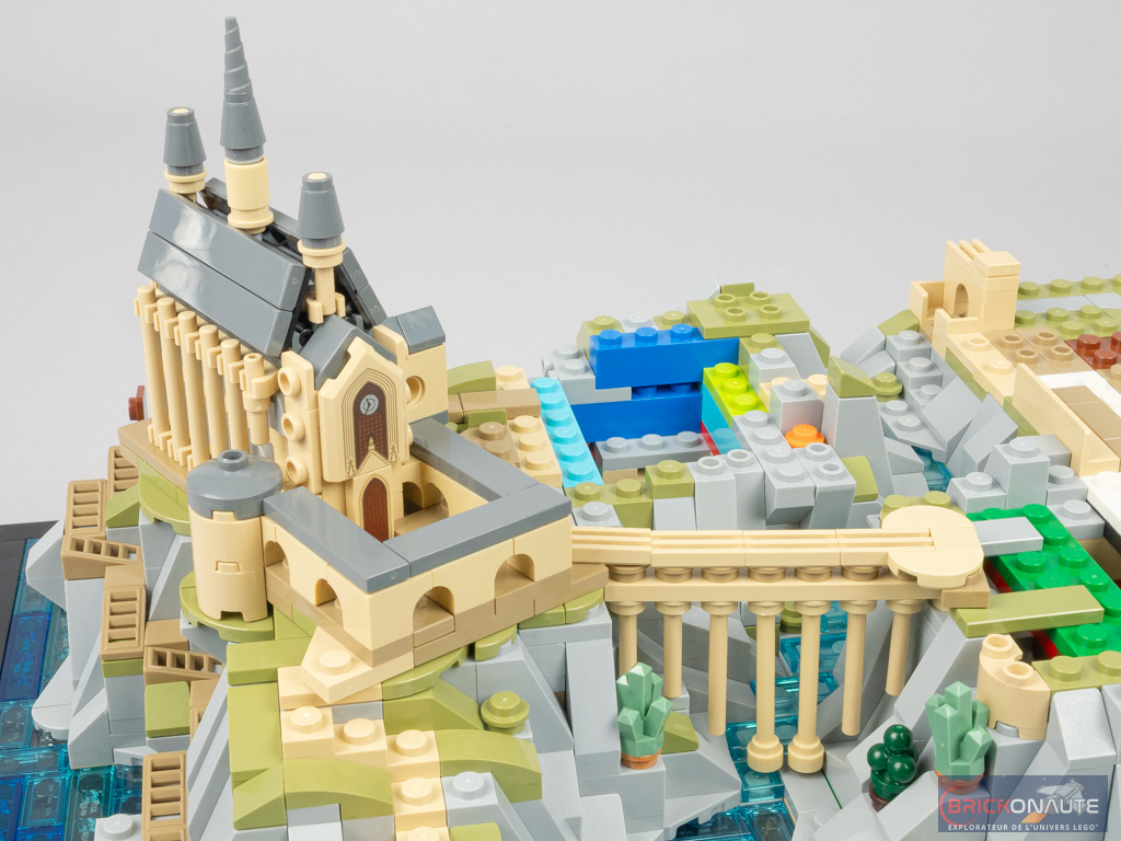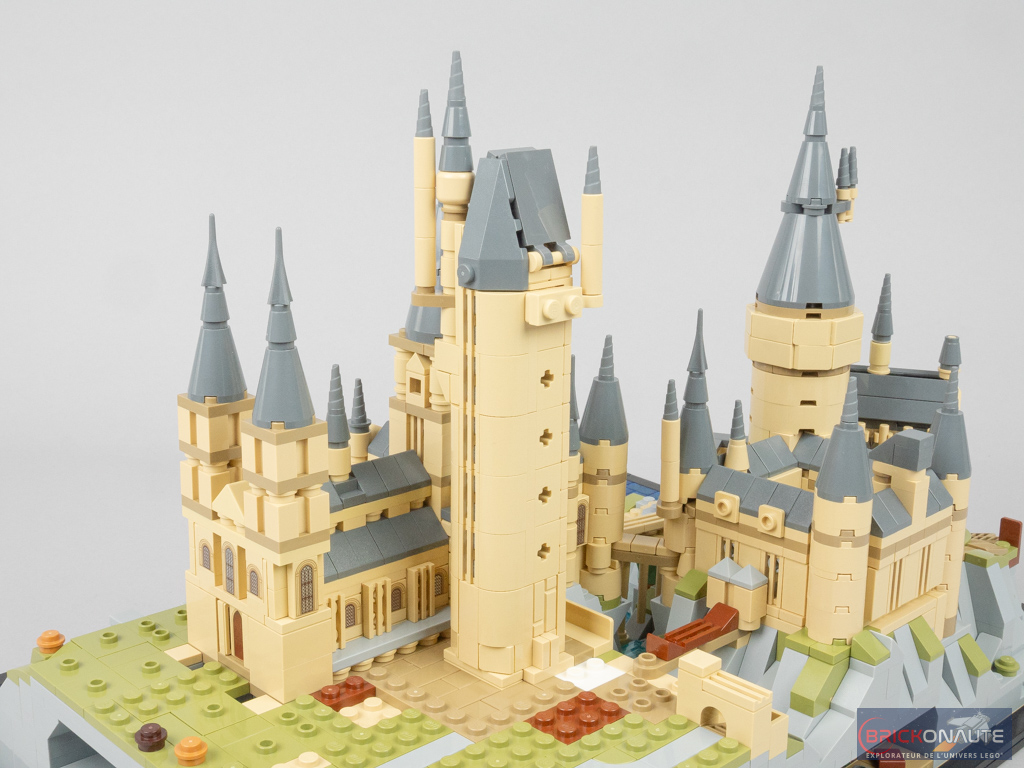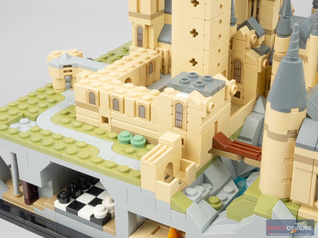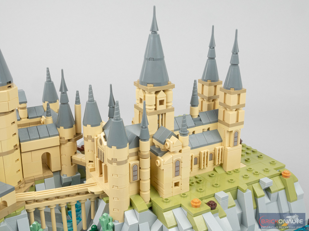 On remarquera aussi une utilisation intelligente de certains éléments – des jumelles se retrouvant ainsi utilisées pour former la base des petites tours du bureau de Dumbledore, l’arrière des tiles inversées de 3 tenons formant de petites fenêtres, des tenons creux pour les yeux de boeuf, des arches pour la cour devant la Grande Salle…