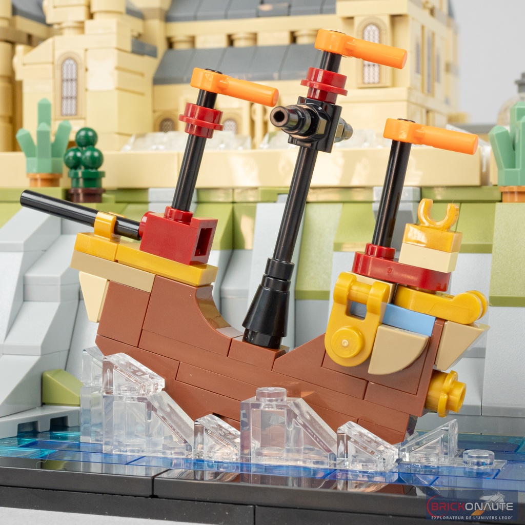 Mais ce que j’aime surtout dans ce set, c’est qu’on peut poser l’oeil à peu près partout on y trouvera toujours quelque-chose à observer : les ponts qui traversent entre les tours, la rivière qui serpente au milieu du château, le chemin qui mène du hangar à bateaux jusqu’à l’école et le sentier qui longe la falaise, les jolies reproduction du bateau de Durmstrang et du carrosse de Beauxbâtons, les petites cours pavées, les serres de Mme Chourave, le Saule Cogneur et la Ford Anglia… et j’en passe ! Juste pour râler, j’aurais aimé retrouver la cabane d’Hagrid et pourquoi pas un micro terrain de Quidditch.