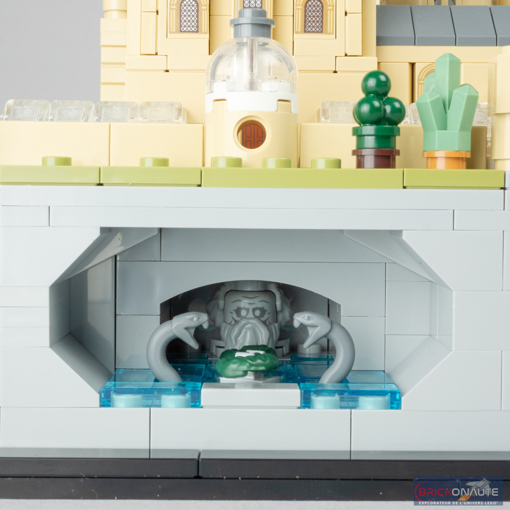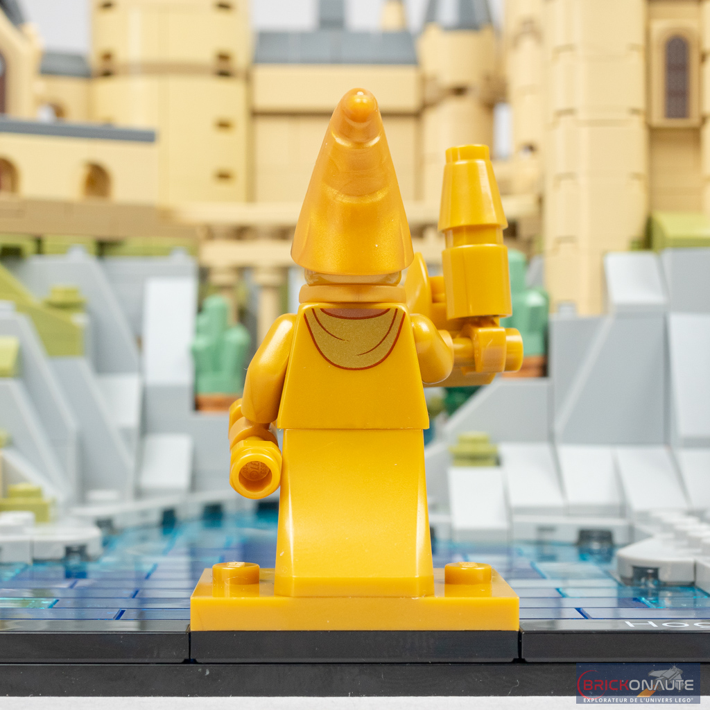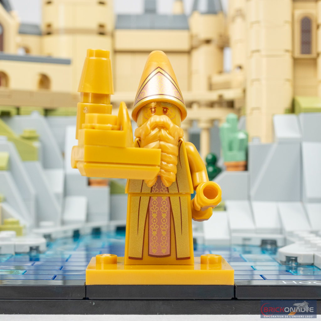 Un petit mot rapide sur la seule minifig du set : il s’agit ici de l’architecte de l’école de Poudlard version dorée, à la manière des minifigs qu’on trouvait dans les sets créées pour célébrer les 20 ans de la gamme LEGO Harry Potter. Cette minifig a été créée exclusivement pour cette boîte et tous les éléments sont joliment tampographiés. La barbe est même un élément totalement nouveau. Des tenons sur la plaque de base du set permettront de l’exposer avec celui-ci.