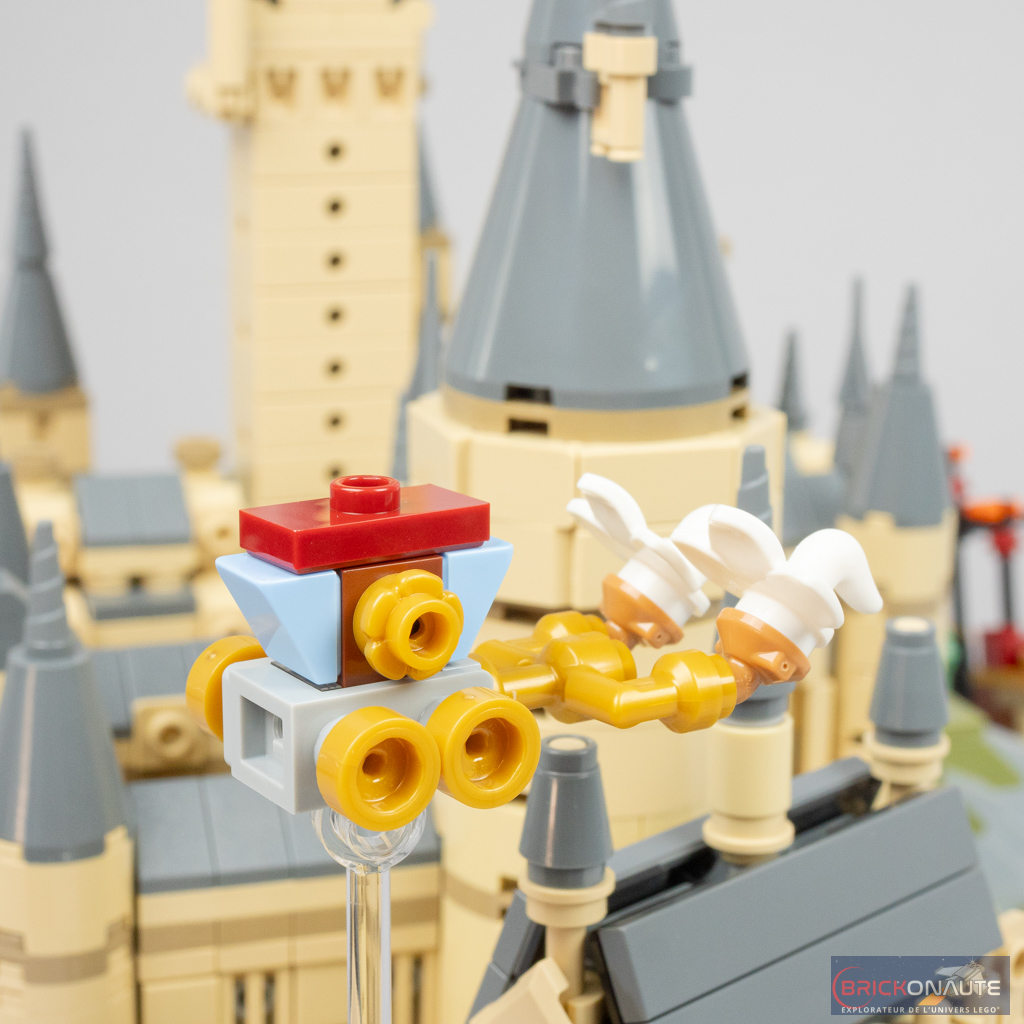 La construction se termine par plusieurs petits assemblages « accessoires » : le bateau de Durmstrang surgissant du Lac Noir, le carrosse de Beauxbâtons fixé sur une tige transparente et une micro Ford Anglia dans les branches du Saule Cogneur. Sans oublier la minifig dorée de l’architecte de Poudlard, qui tient dans sa main une maquette de sa construction.