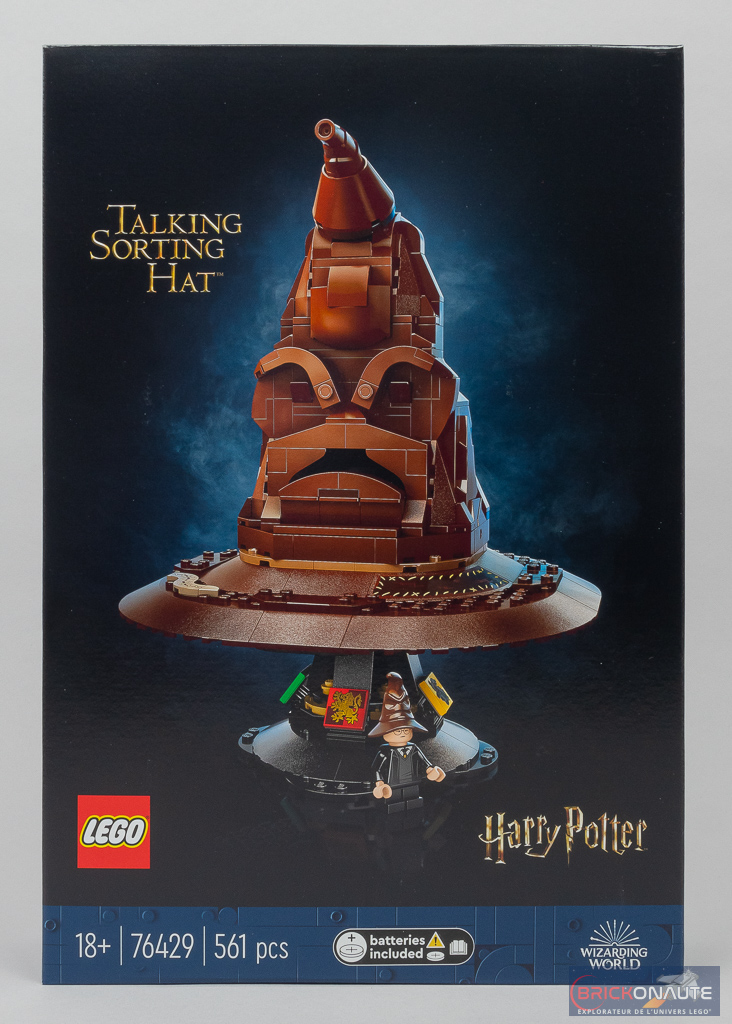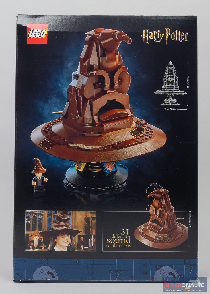 Il s’agit de la seule référence LEGO Harry Potter « 18+ » attendue pour le 1er mars, et la boîte reprend les codes habituels de ces sets visant un public adulte : le set nous est présenté sur fond noir, avec une bande colorée reprenant les principales informations. Au dos, on retrouve une seconde vue du Choixpeau, un schéma avec ses dimensions (25cm de haut sur son support) et deux vignettes : une photo du film, et une autre nous précisant que le Choixpeau propose 31 combinaisons de sons différentes. Une petite mention sur le côté de cette vignette nous indique que les voix sont uniquement en anglais.