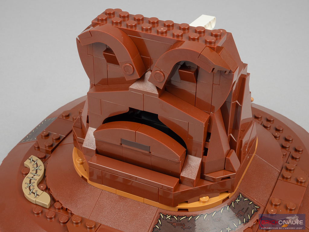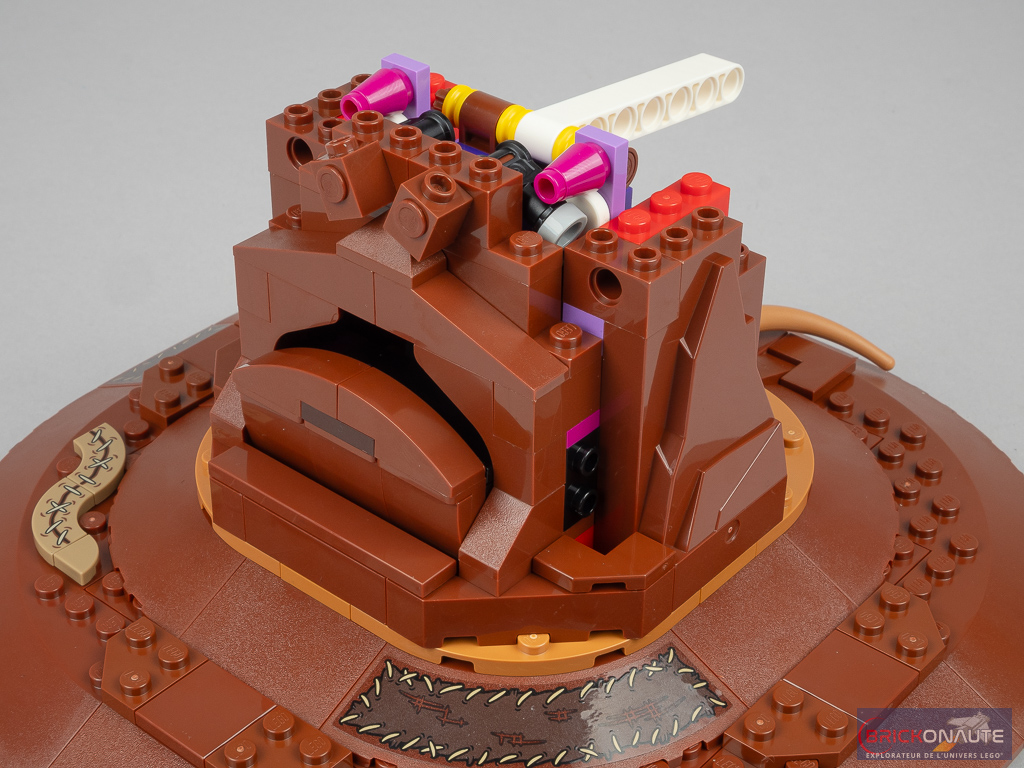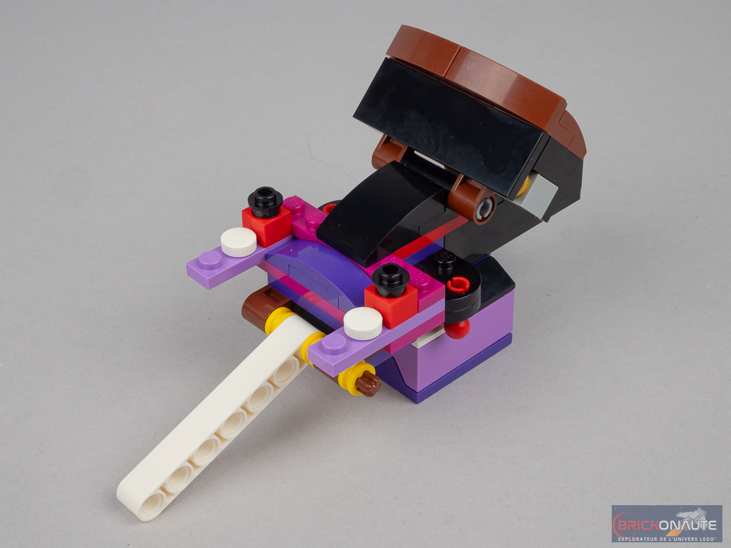 Ce n’est qu’ensuite qu’on s’attelle à la construction du mécanisme. La brique sonore est fixée à un sous-ensemble mobile qui s’activera soit en poussant sur le dessous, soit en tirant sur le beam Technic au-dessus. Un petit sous-ensemble retenu par deux élastiques permettra d’ouvrir la bouche lors de l’activation.